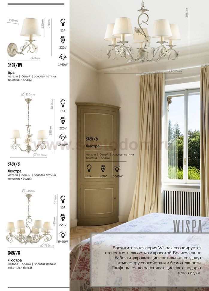 Храктерная особенность артикула 3497/3: Восхитительная серия Wispa ассоциируется с юностью, нежностью и красотой. Великолепные бабочки, украшающие светильник, создадут атмосферу спокойствия и безмятежности. Плафоны, мягко рассеивающие свет, подарят тепло и уют