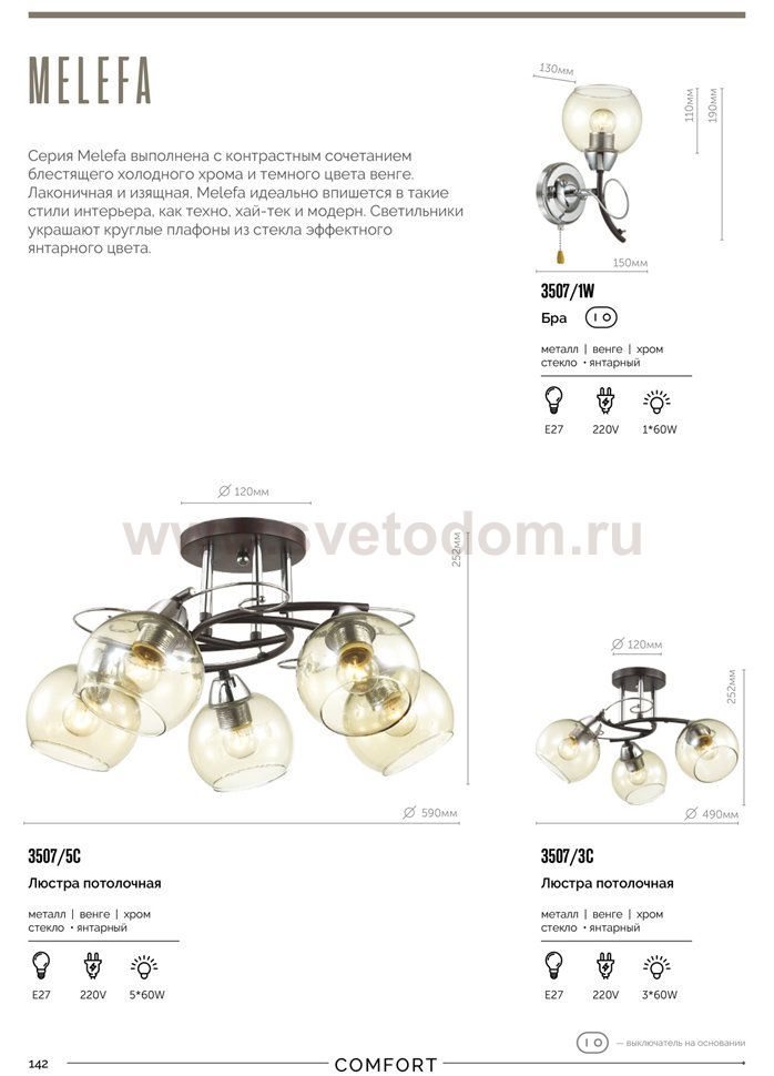 Линия Melefa выполнена с контрастным сочетанием блестящего холодного хрома и темного цвета венге, который идеально впишется в такие стили интерьера, как техно, хай - тек, индастриал. Светильник украшают круглые плафоны из стекла с эффектным бронзовым оттенком. Диаметр основания 105 мм, размер плафона 130x110 мм.