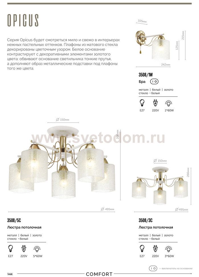 Линия Opicus будет смотреться мило и свежо в интерьерах нежных пастельных оттенков. Серию украшают белая арматура с золотой патиной, тонкие золотые элементы, изящно обвивающие основание светильника, а также плафоны из белоснежного матового стекла с нежным узором. Диаметр основания 105 мм, размер плафона 95x125 мм.