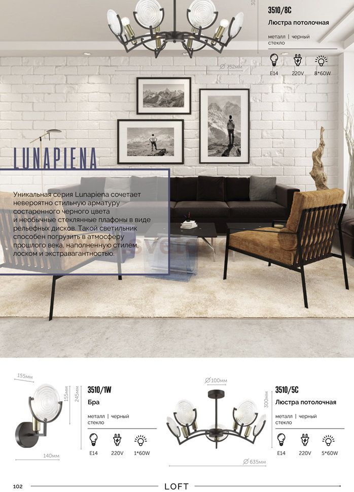 Уникальная линия Lunapiena сочетает невероятно стильную арматуру состаренного чёрного цвета со смелым дизайном и необычные стеклянные плафоны в виде рельефных дисков. Такой светильник способен погрузить в атмосферу прошлого века, наполненной стилем, лоском и экстравагантностью