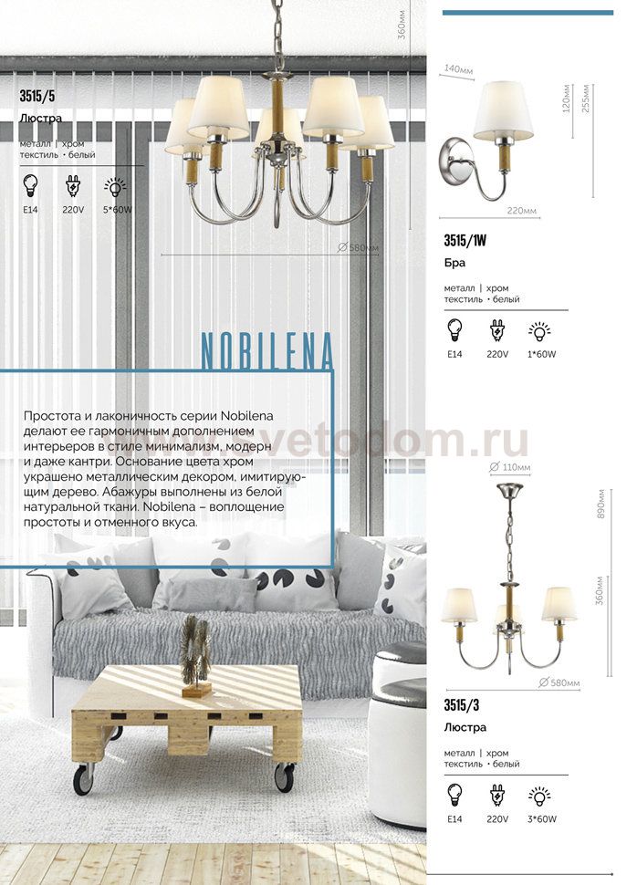 Храктерная особенность артикула 3515/5: Простота и лаконичность формы серии Nobilena делают ее гармоничным дополнением интерьеров в стиле минимализм, модерн и даже кантри. Основание металлическое, окрашенное в хромовый цвет, светильник украшен металлическим декором, имитирующим дерево, абажуры выполнены из белой натуральной ткани. Светильники этой серии - это воплощение простоты и отменного вкуса