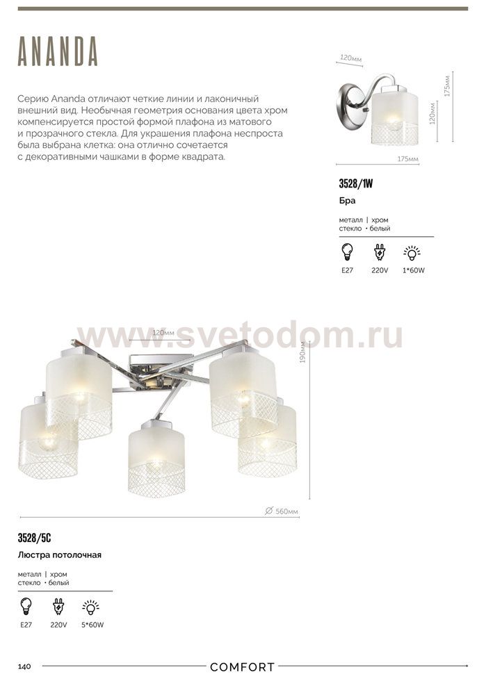 Храктерная особенность артикула 3528/5C: Серию Ananda отличают четкие линии и простота материалов: арматура светильника состоит из металла, покрытого цветом хром, плафон простой геометрической формы состоит из матового и прозрачного стекла. Тем не менее, блестящий цвет основания, красивый узор на стекле, делает светильник несомненно запоминающимся, ярким и очень эффектным
