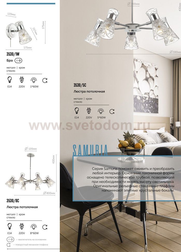 Храктерная особенность артикула 3530/1W: Очень необычная коллекция Samuria состоит из арматуры простого, незамысловатого дизайна и сложных рельефных стеклянных плафонов, напоминающих элитные дорогие хрустальные бокалы. Светильник дает очень много света, что может оживить и преобразить любой интерьер