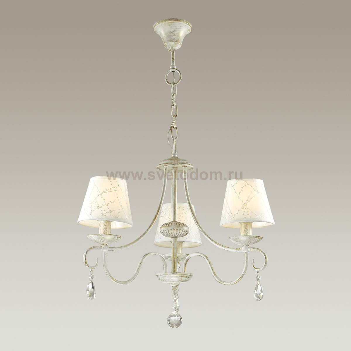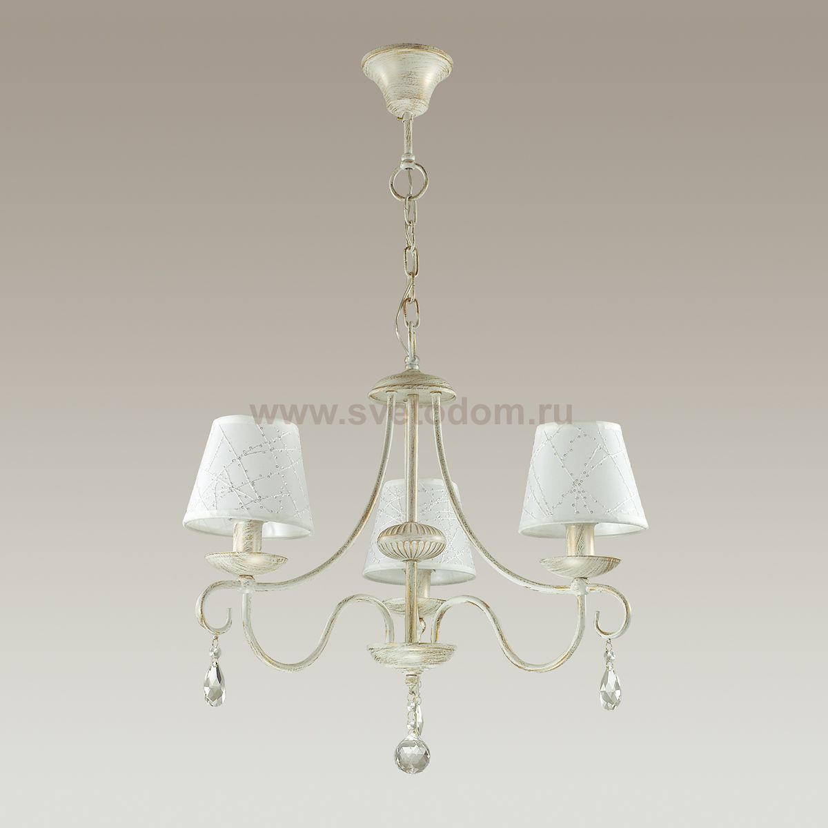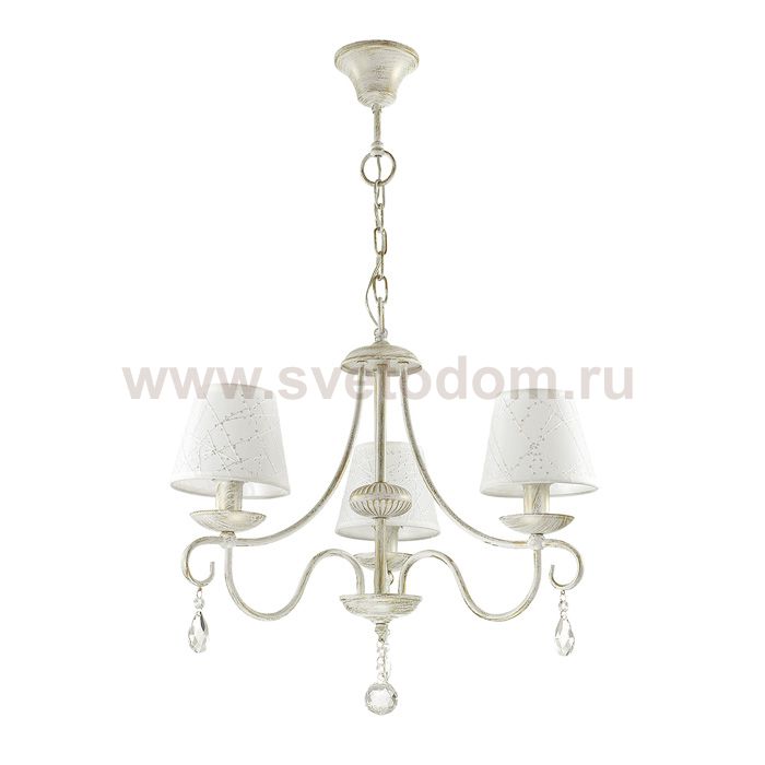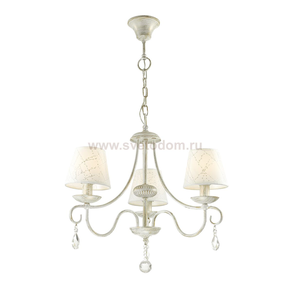Храктерная особенность артикула 3686/3: Серия Blanche - в белом цвете с золотой патиной смотрится невероятно легко и воздушно благодаря плавным линиям рожков, белоснежным белым абажурам с оригинальным декором. Хрусталь в подвесках прозрачного света придает изделию радужную игру света.
