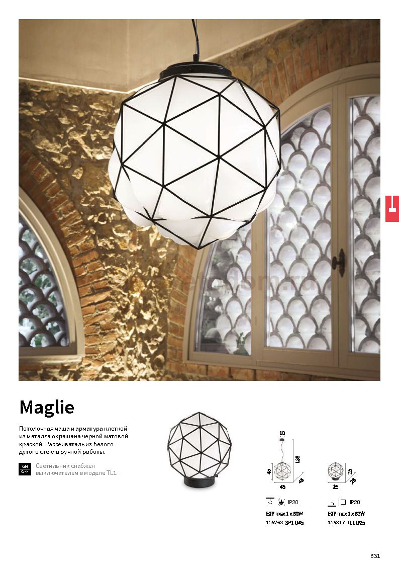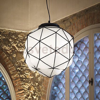 Подвесной светильник от известной итальянской фабрики Ideal lux из каталога Classico в классическом стиле под артикулом MAGLIE SP1 D45 (159263) серии MAGLIE имеет ряд отличительных характеристик: Потолочная чаша и арматура клеткой из металла окрашена чёрной матовой краской. Рассеиватель из белого дутого стекла ручной работы.