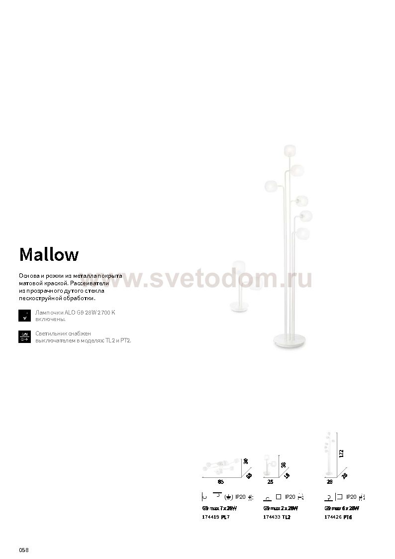 Торшер от известной итальянской фабрики Ideal lux из каталога Moderno в современном стиле под артикулом MALLOW PT6 (174426) серии MALLOW имеет ряд отличительных характеристик: Основа и рожки из металла покрыта матовой краской. Рассеиватели из прозрачного дутого стекла пескоструйной обработки.