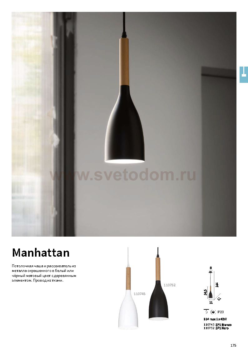 Подвесной светильник от известной итальянской фабрики Ideal lux из каталога Moderno в современном стиле под артикулом MANHATTAN SP1 BIANCO (110745) серии MANHATTAN имеет ряд отличительных характеристик: Потолочная чаша и рассеиватель из 8 металла окрашенного в белый или чёрный матовый цвет с деревянным элементом. Провод из ткани.