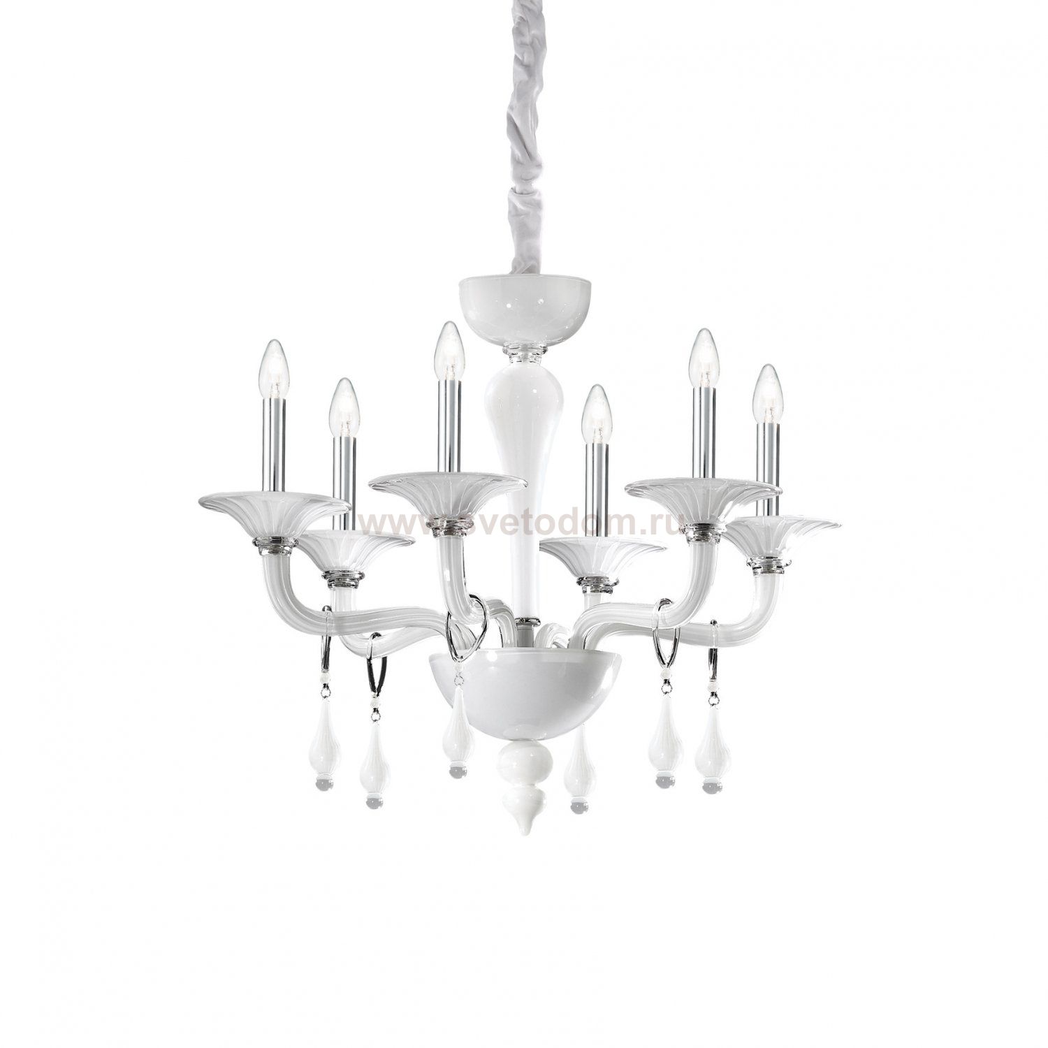 Люстра от известной итальянской фабрики Ideal lux из каталога Classico в венецианском стиле под артикулом MIRAMARE SP6 (68183) серии MIRAMARE имеет ряд отличительных характеристик: Люстра из прозрачного и белого дутого стекла ручной работы. Покрывающие патроны колбы из хромированного металла. Цепь скрыта бархатной цепью.