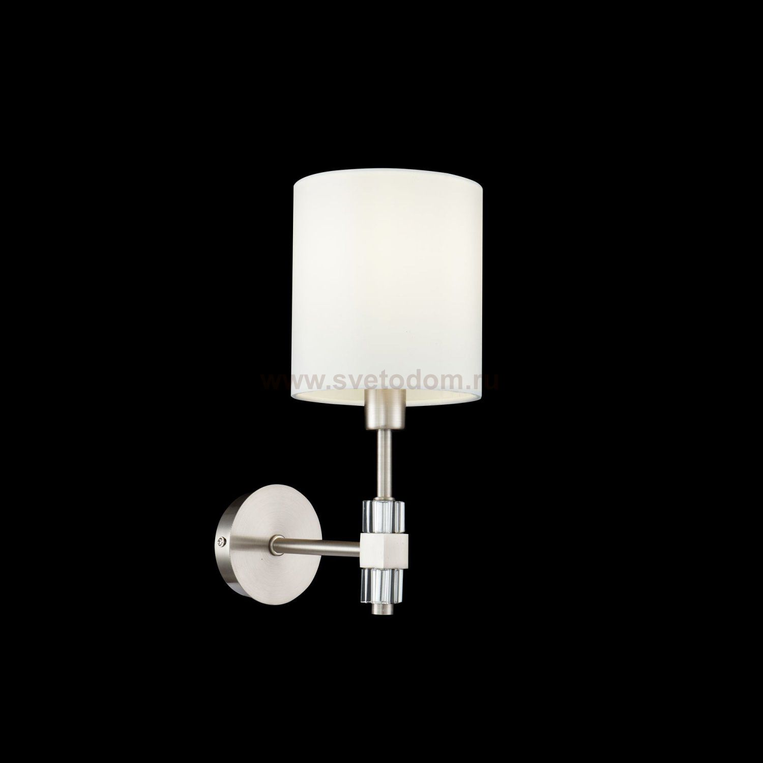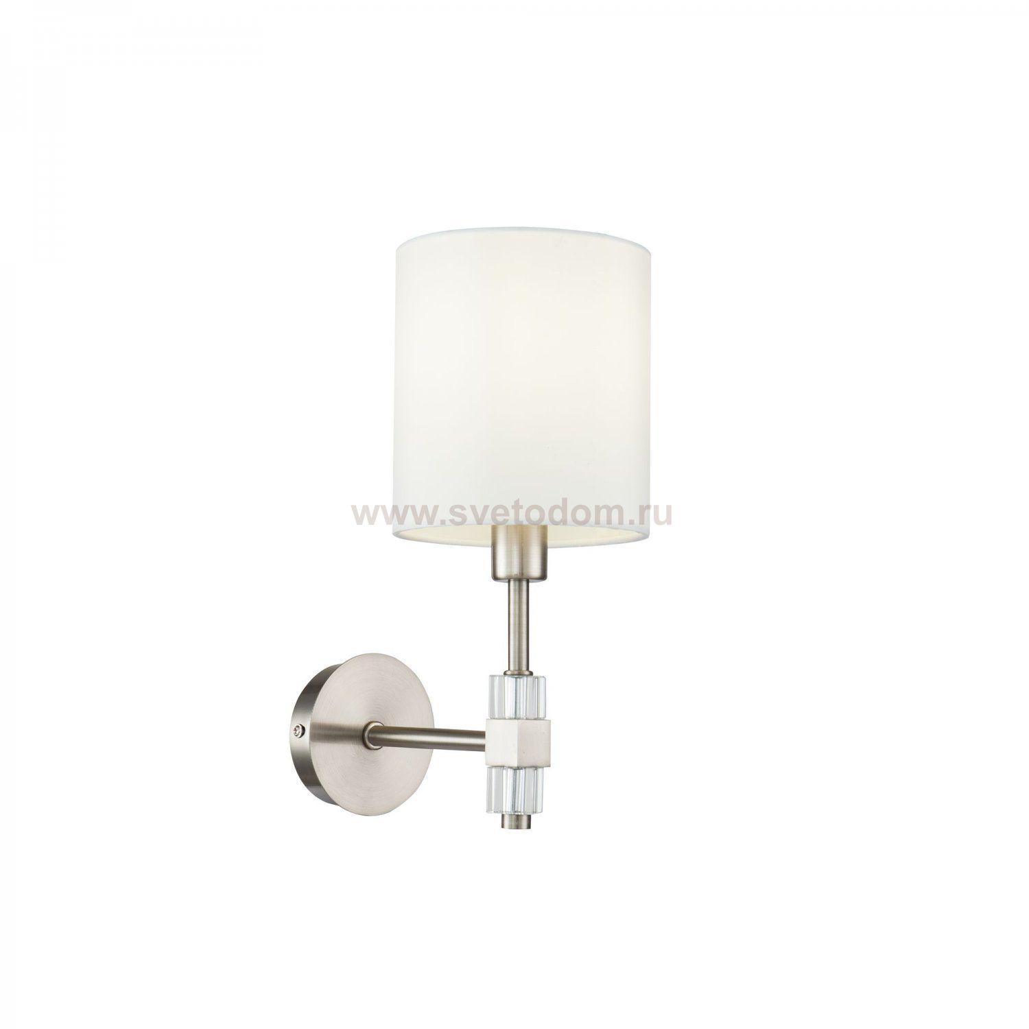 Арматура из металла. Рожки дополнены стеклянными элементами. Абажур из ПВХ покрыт белой тканью. Основание абажура - цилиндр. Комментарий