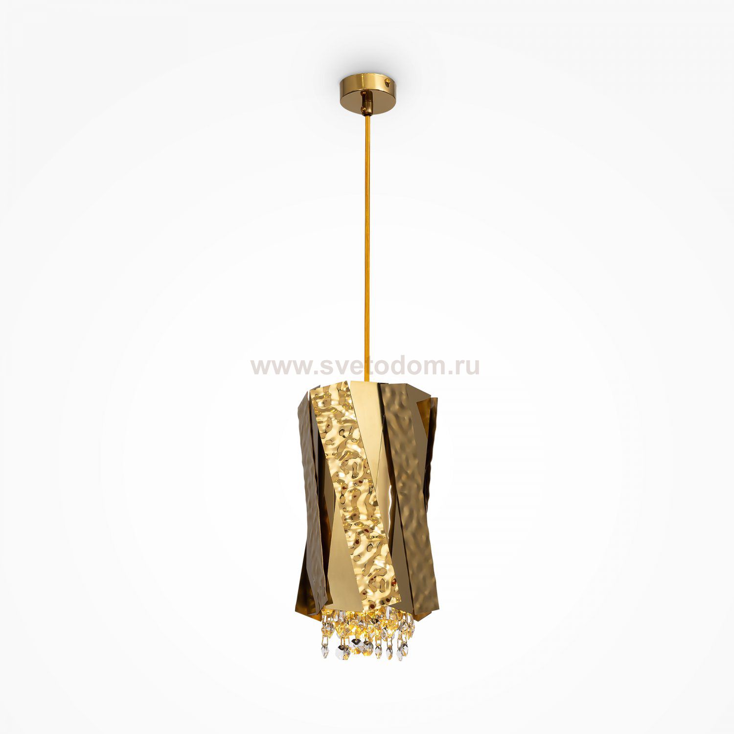 Арматура – нержавеющая сталь, цвет – латунь. Комбинация фактурных и гладких металлических пластин в декоре. Стеклянные подвески обрамляют источники света.