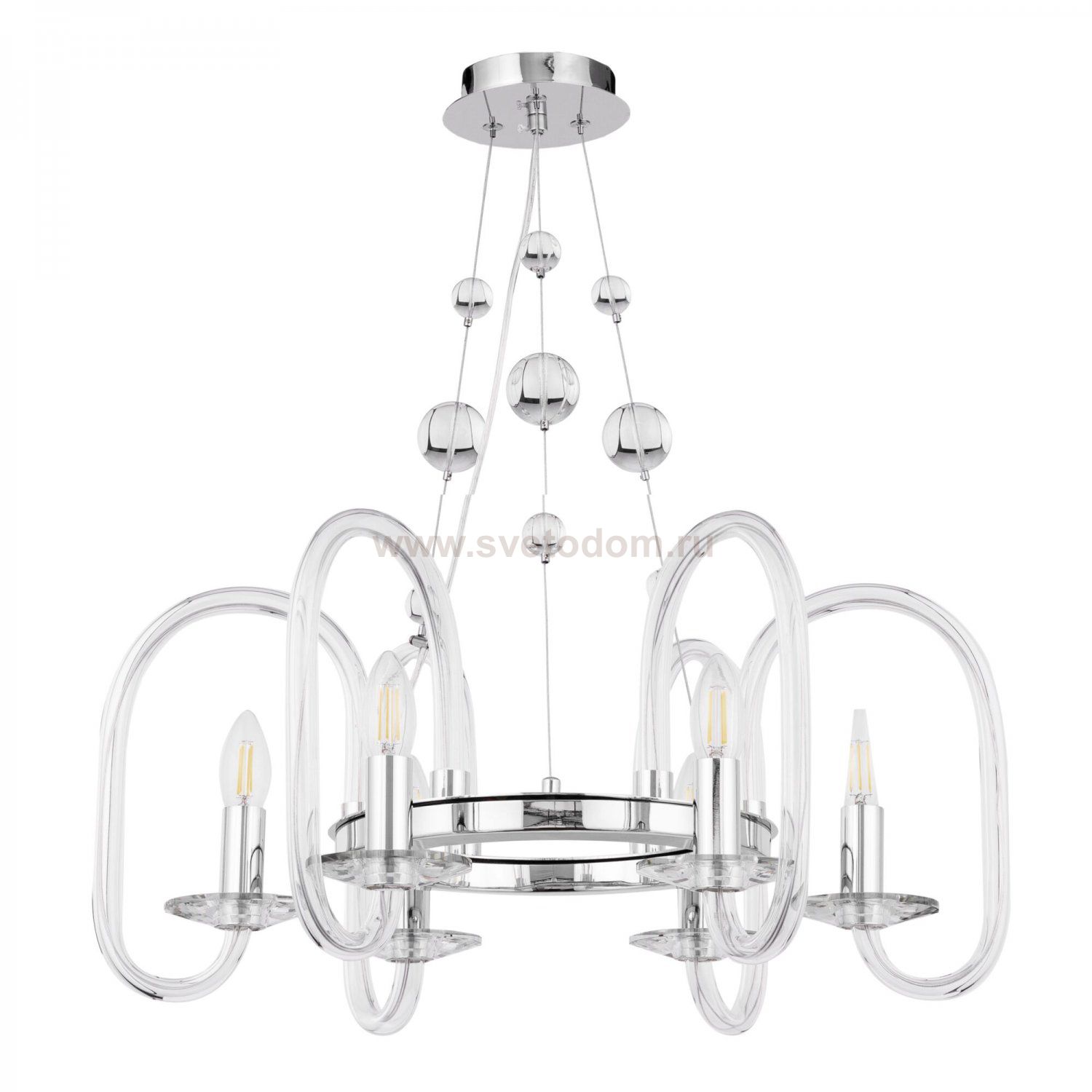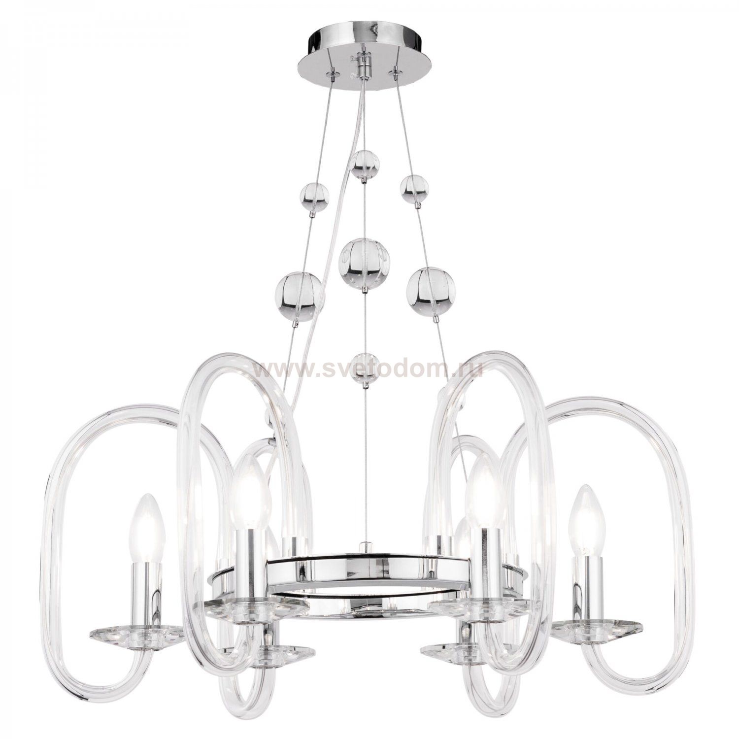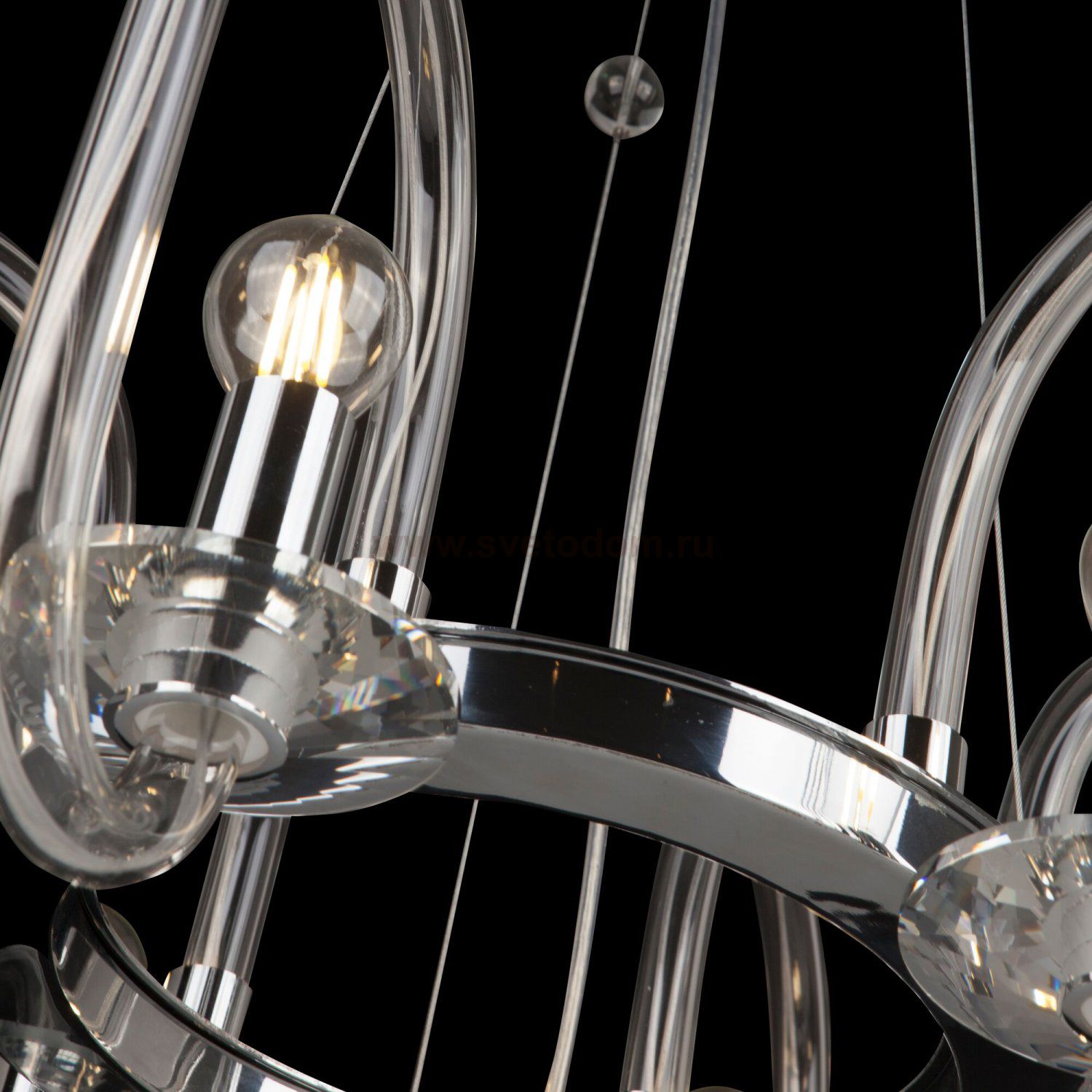 Особенности модели MOD026PL-06CH: Основной чертой подвесных светильников серии стала необычная конструкция. Рожки из прозрачного стекла равномерно распределены на металлических кольцах разного диаметра. Визуальной легкости светильникам добавляют стеклянные шары, закрепленные на тросах. Длину тросов возможно отрегулировать.
