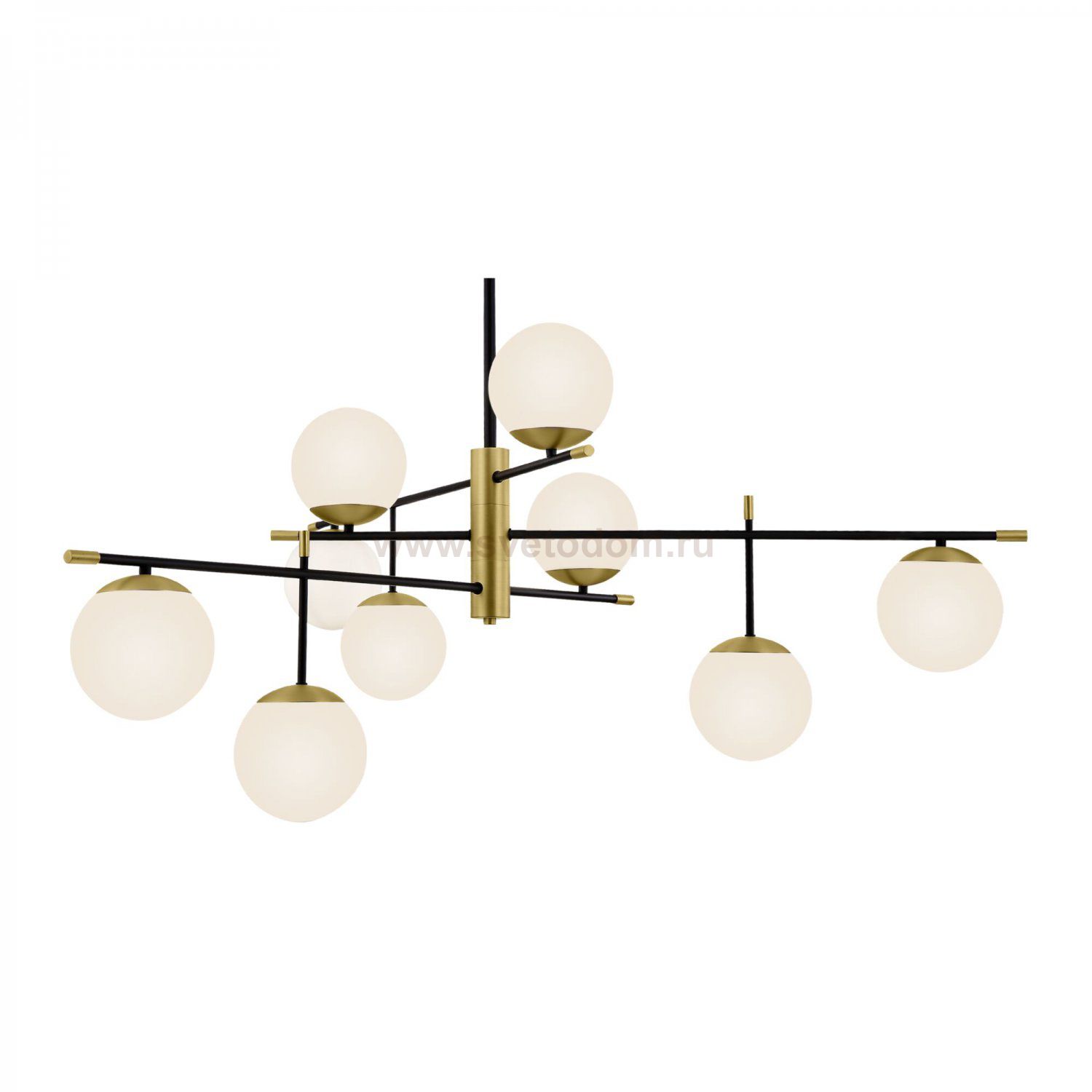 Арматура из металла в цвете матового золота. Плафоны-сферы из матового выдувного стекла. Модная асимметрия в дизайне. Источник света — лампы с цоколем Е14.