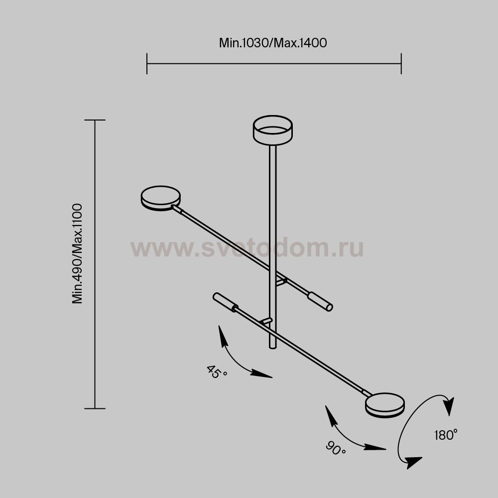 Плафоны и арматура из металла. Цвет рассеивателя — белый, арматура черная или белая. Конструкция предусматривает шарнирный механизм, позволяющий регулировать направление света и высоту светильников. Плафоны вращаются на 90 и 360° (в вертикальной и горизонтальной плоскостях). Угол рассеивания — 120 градусов. Тип света — рассеянный.
