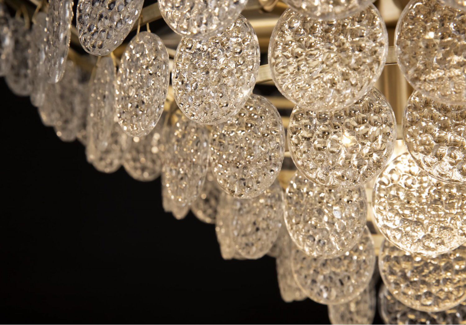 Материал арматуры – металл, цвет – золото. Фактурный декор из прозрачного стекла. Округлые подвески с рельефным узором скрывают источники света – лампы с цоколем Е14.