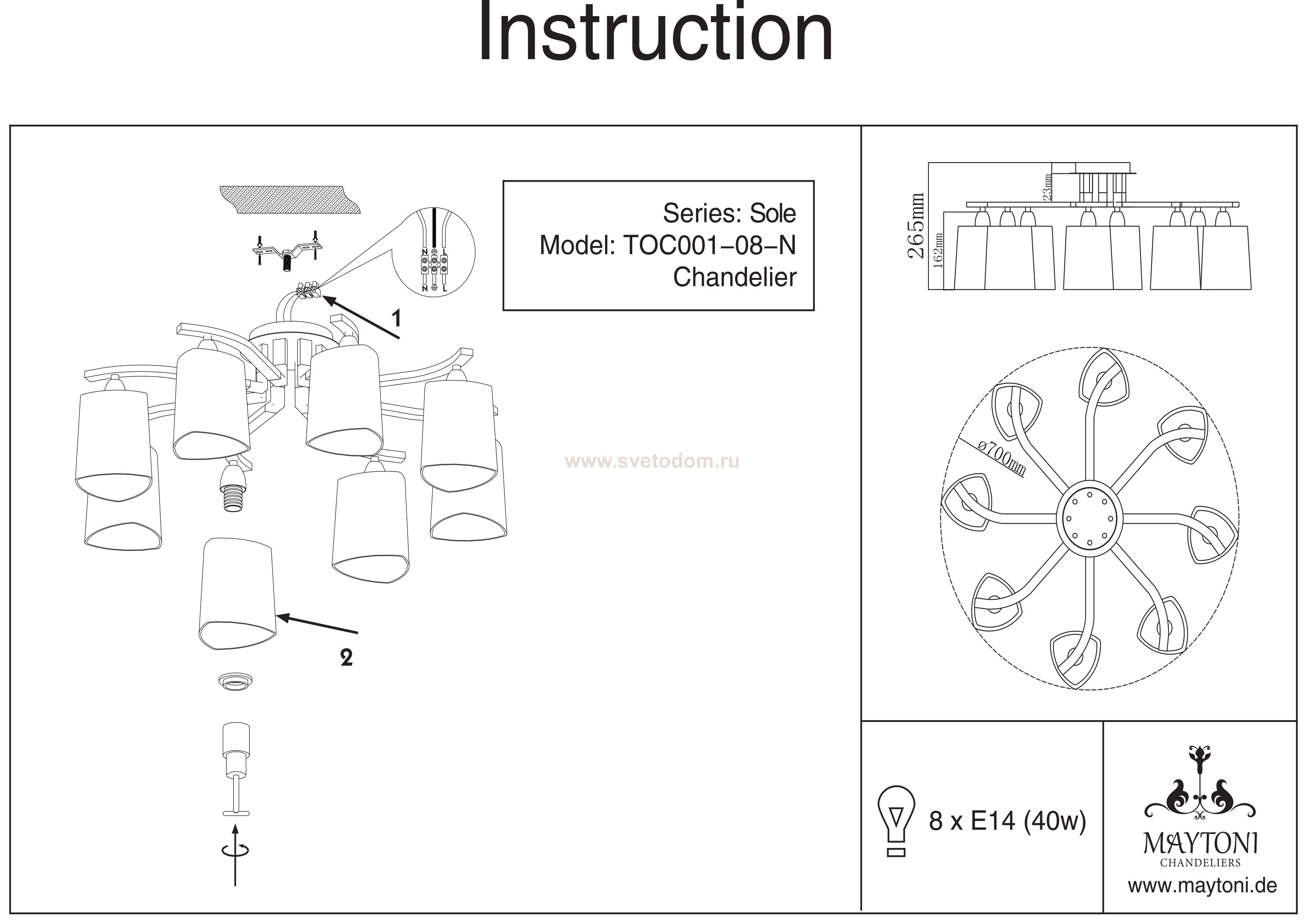 Если вы решили купить удобный, функциональный и в то же время роскошный осветительный прибор, то потолочная люстра от компании Майтони станет самым подходящим элементом. Люстра потолочная Maytoni MOD131-CL-08-N сочетает в себе отличное немецкое качество и достаточно приемлемую цену. Посмотрев на фото этой люстры от Maytoni, вы увидите, что в ее состав входит каркас, на котором располагаются восемь белоснежных плафонов. Арматура сочетает в себе красоту и привлекательность хромированного металла и теплое благородство оттенка «светлый Венге». Лампочки нужно будет |