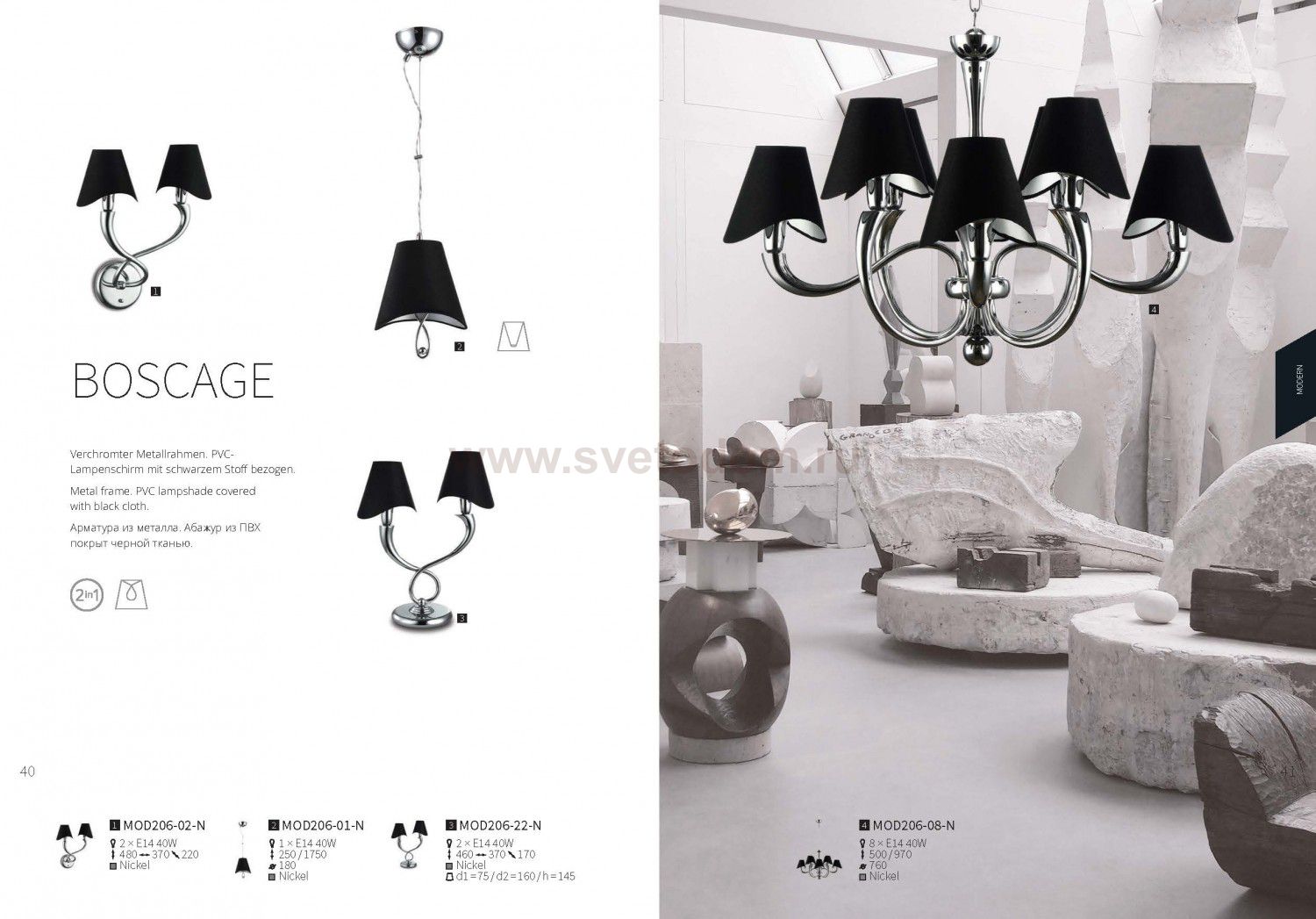 Особенности модели MOD206-02-N: Витиеватые изгибы хромированных рожков, переплетающихся между собой, а также абажуры из ткани на ПВХ с волнистым краем, стали основной чертой светильников серии Boscage. Универсальное крепление "2 в 1" позволяет монтировать люстры с использованием цепи или без нее. Высоту подвесных светильников возможно регулировать длиной троса.