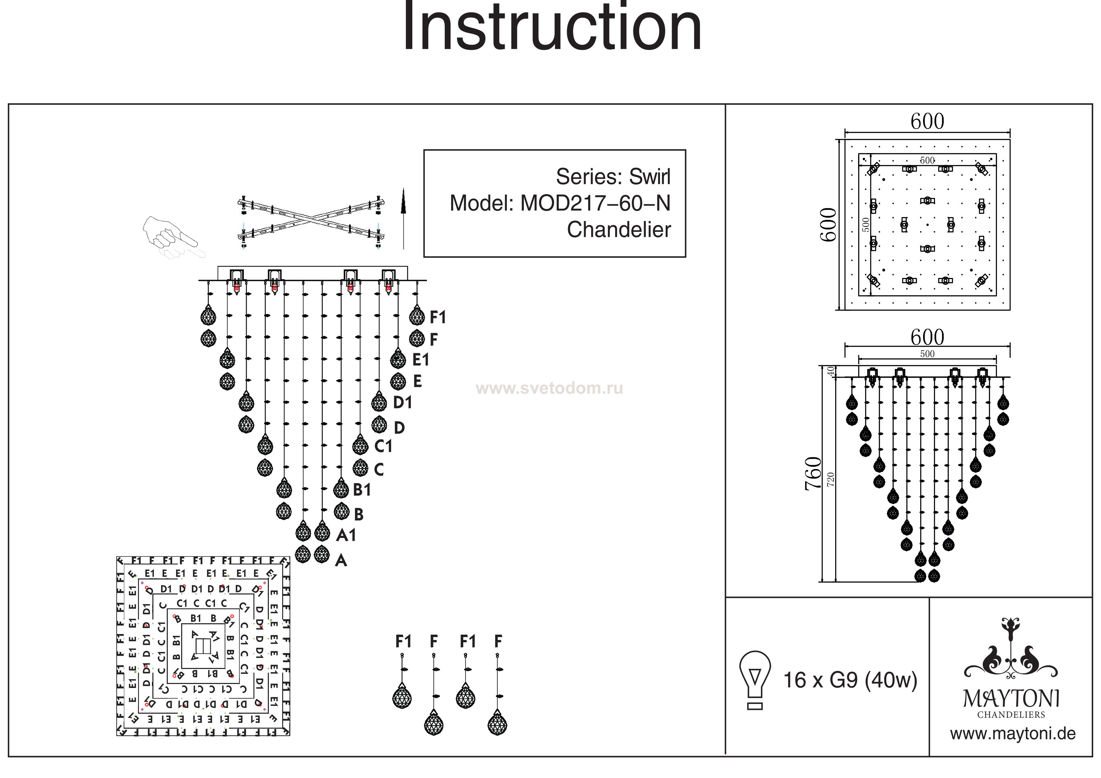 Изображенная на фото немецкая потолочная люстра торговой марки Майтони, выполненная в стиле модерн, имеет высоту 800 миллиметров и ширину 600 миллиметров. Ее уместно купить для интерьеров современного дизайна. Несмотря на свои размеры, потолочная люстра Maytoni Modern MOD217-60-N смотрится очень аккуратно и воздушно за счет прозрачных подвесок, прикрепленных к никелированной арматуре. К тому же представленная на сайте цена вполне адекватна, так как подобные изделия отличаются своей высокой стоимостью. К люстре от Maytoni понадобится 16 ламп с цоколем G9 по 40 Ватт. |