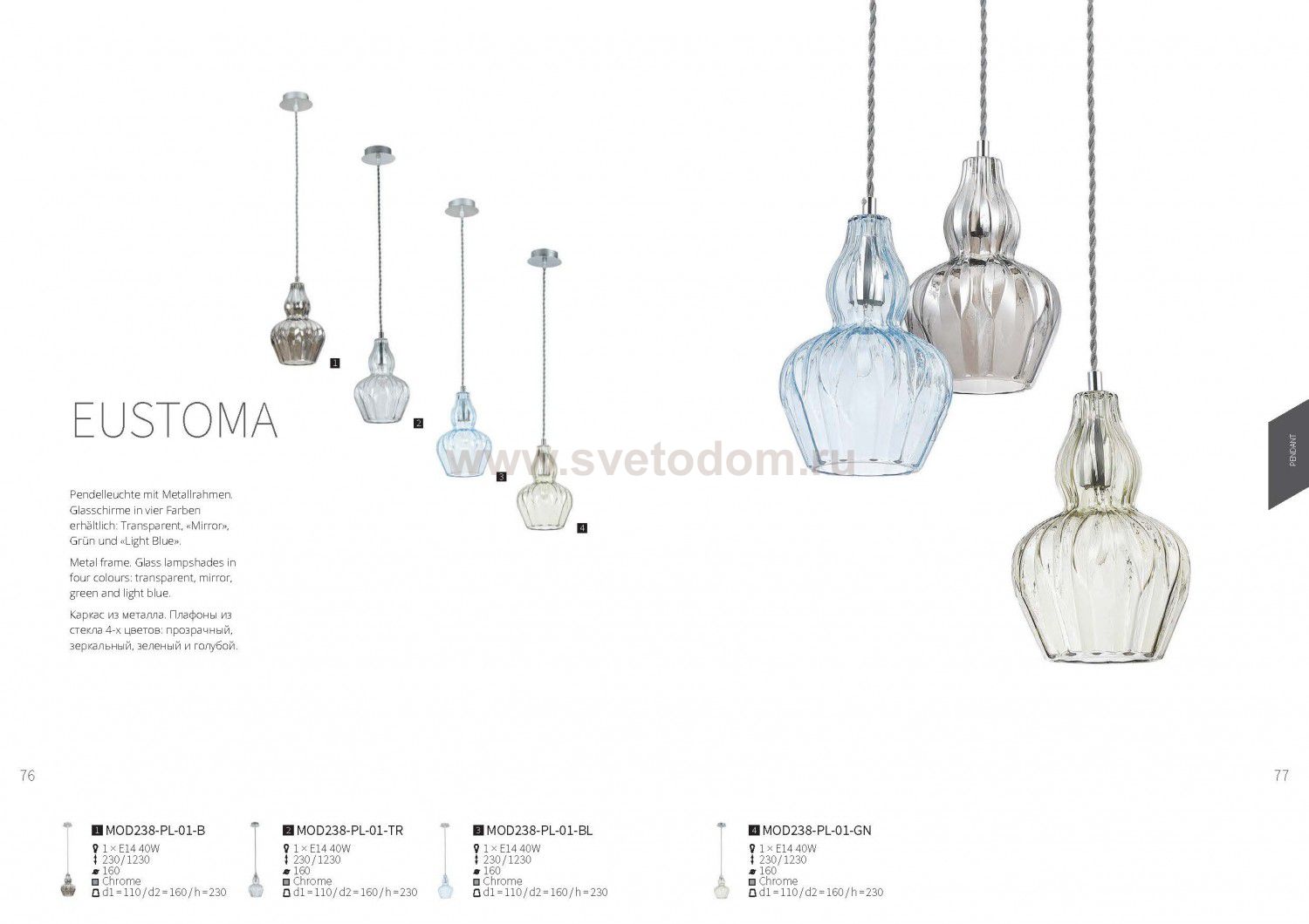 Каркас из металла. Плафоны из стекла 4-х цветов: прозрачный, зеркальный, зеленый и голубой. Дополнительно
