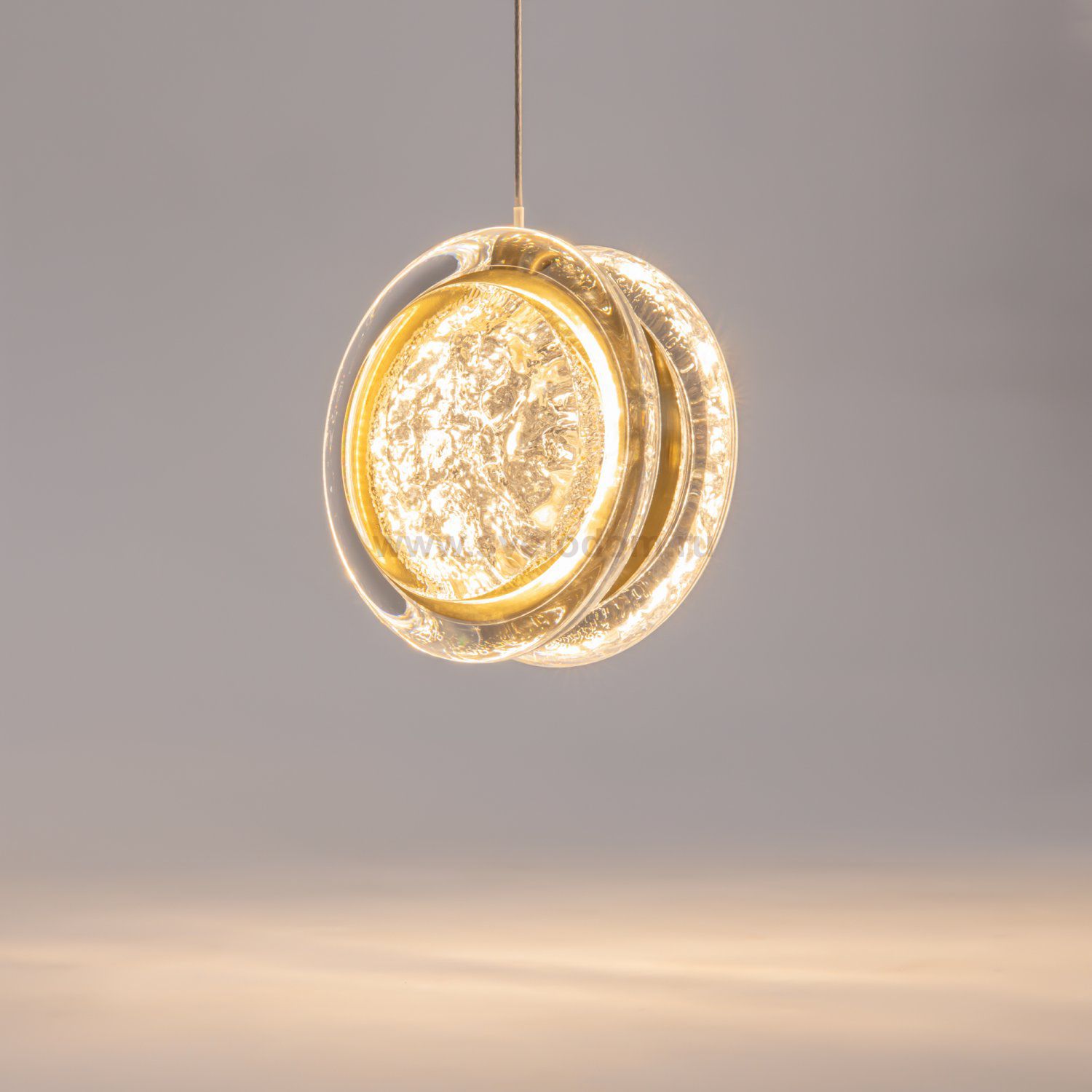 Арматура из металла цвета латунь с сатинированным финишным покрытием сочетается с прозрачными плафонами. Подвесные одинарные, горизонтальный и каскадные светильники оснащаются LED-модулем с двумя плоскими плафонами из акрила со сложным, актуальным паттерном на поверхности. Цветовая температура — 3000К, угол рассеивания — 125 градусов.