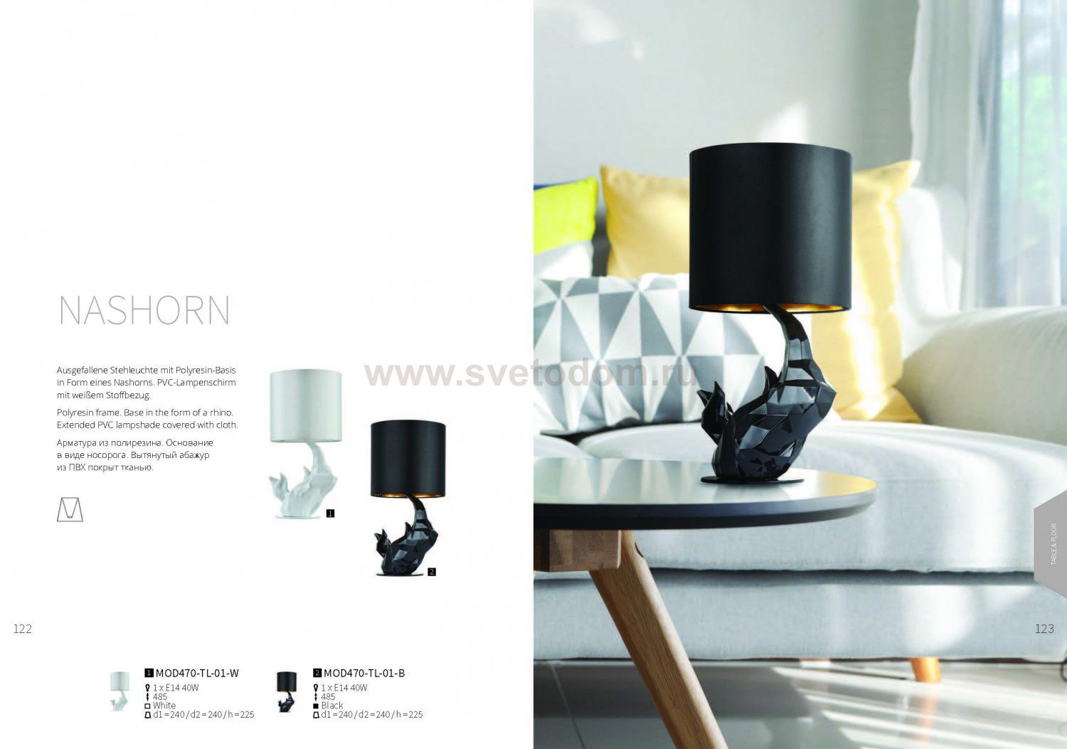 Особенности модели MOD470-TL-01-B: Полигональная структура модели, часто используемая при объемном моделировании, перенесена на прочный современный материал – полирезин. В результате получился новый декоративный образ. Фигура носорога выполняет роль основания. Абажур изготовлен из хлопковой ткани, нанесенной на ПВХ. Модели серии представлены в глянцевом белом и черном цвете. Настольная лампа и бра двух оттенков станут эффектным акцентом в зональной подсветке современного интерьера.