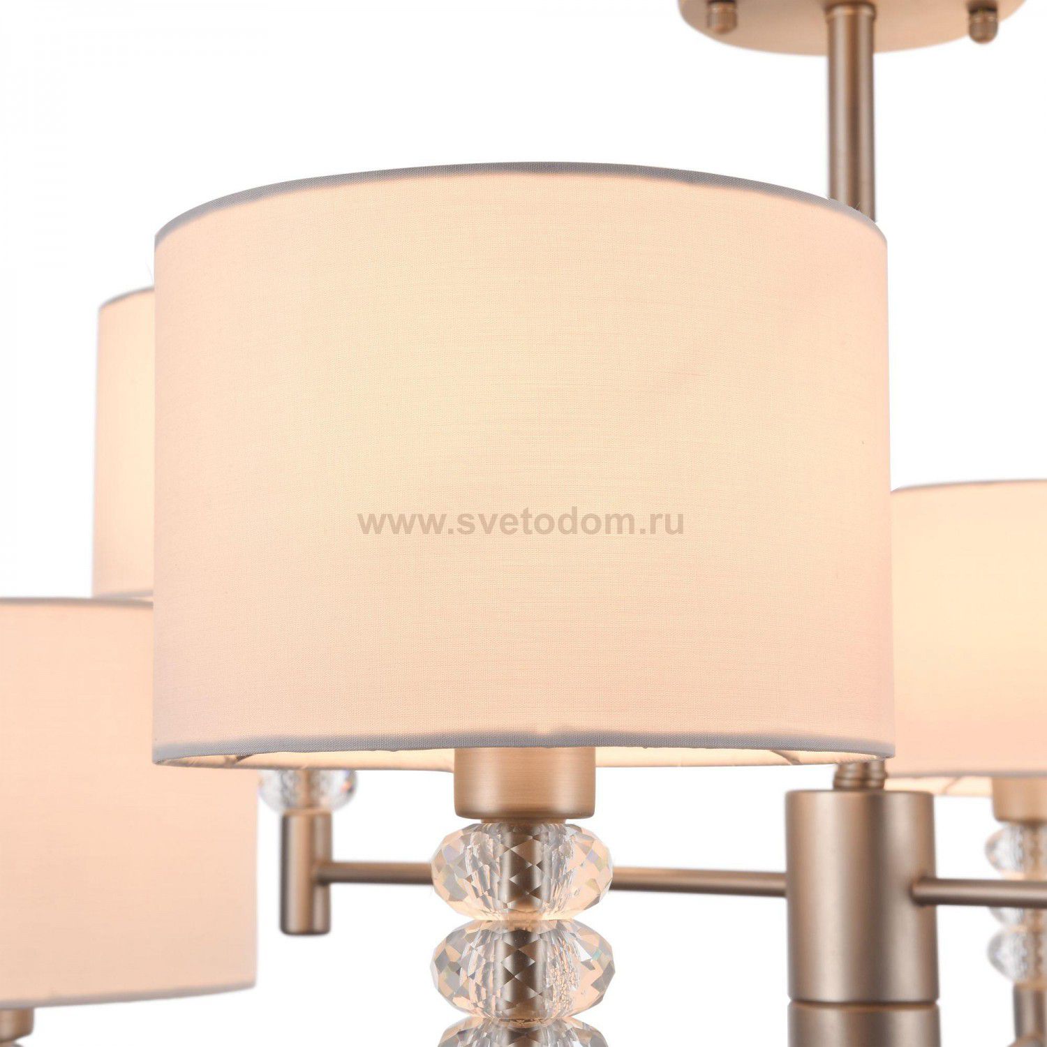 Металлическая арматура с гальваническим покрытием, цвет – никель. Абажуры из белого текстиля, нанесенного на ПВХ. Декор рожков – граненые кристаллы.
