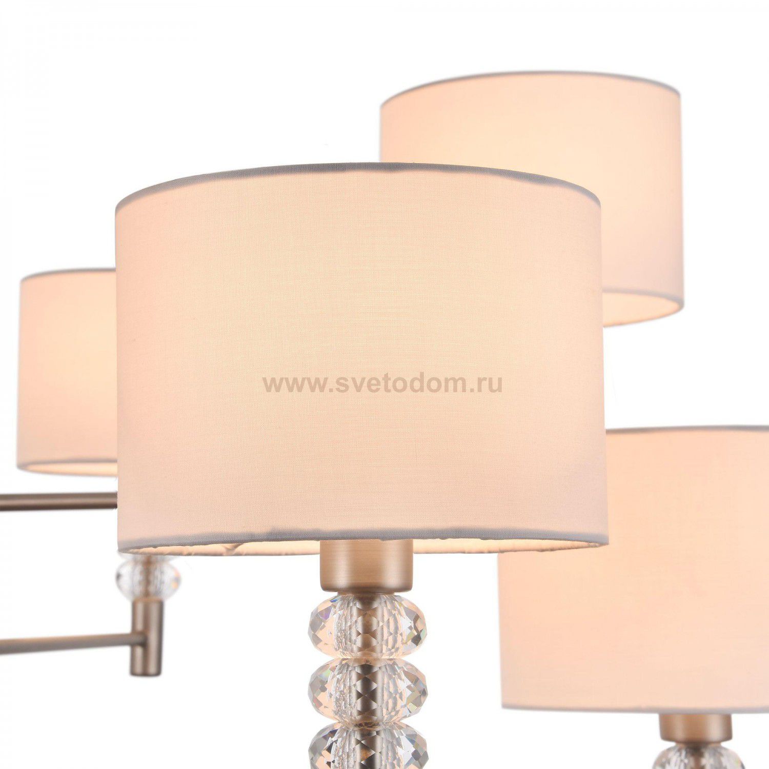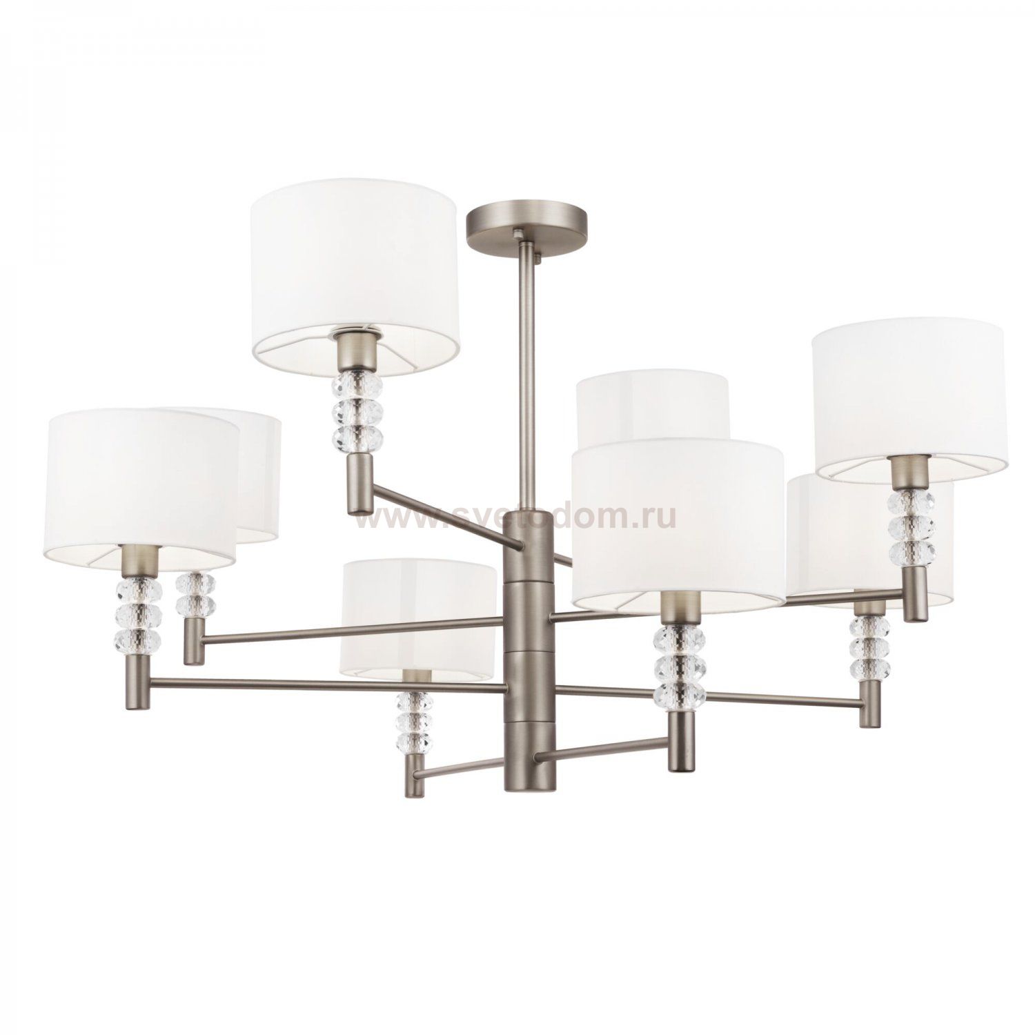 Металлическая арматура с гальваническим покрытием, цвет – никель. Абажуры из белого текстиля, нанесенного на ПВХ. Декор рожков – граненые кристаллы.