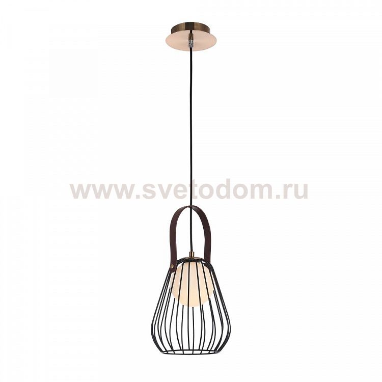 Каркас из металлических прутьев. Дополнен элементом в виде кожаного ремешка. Декоративный плафон из белого матового стекла. Цвет плафона / абажура