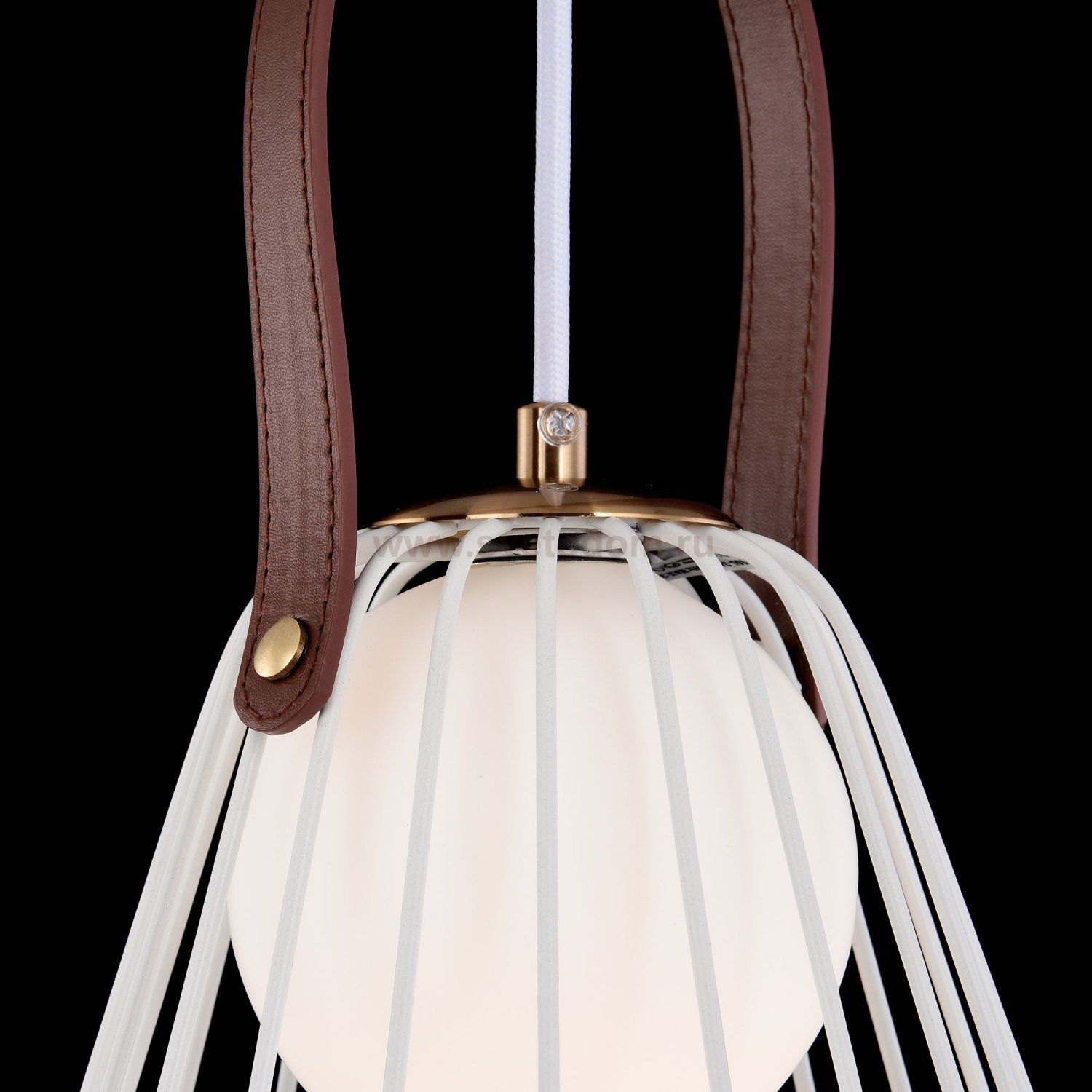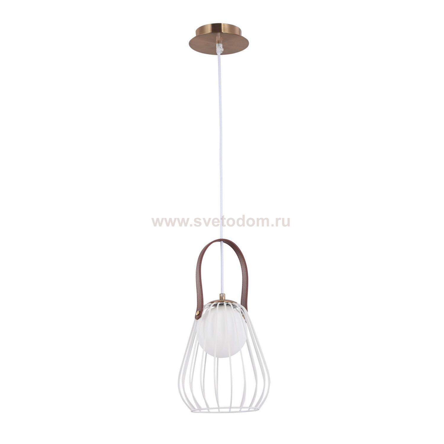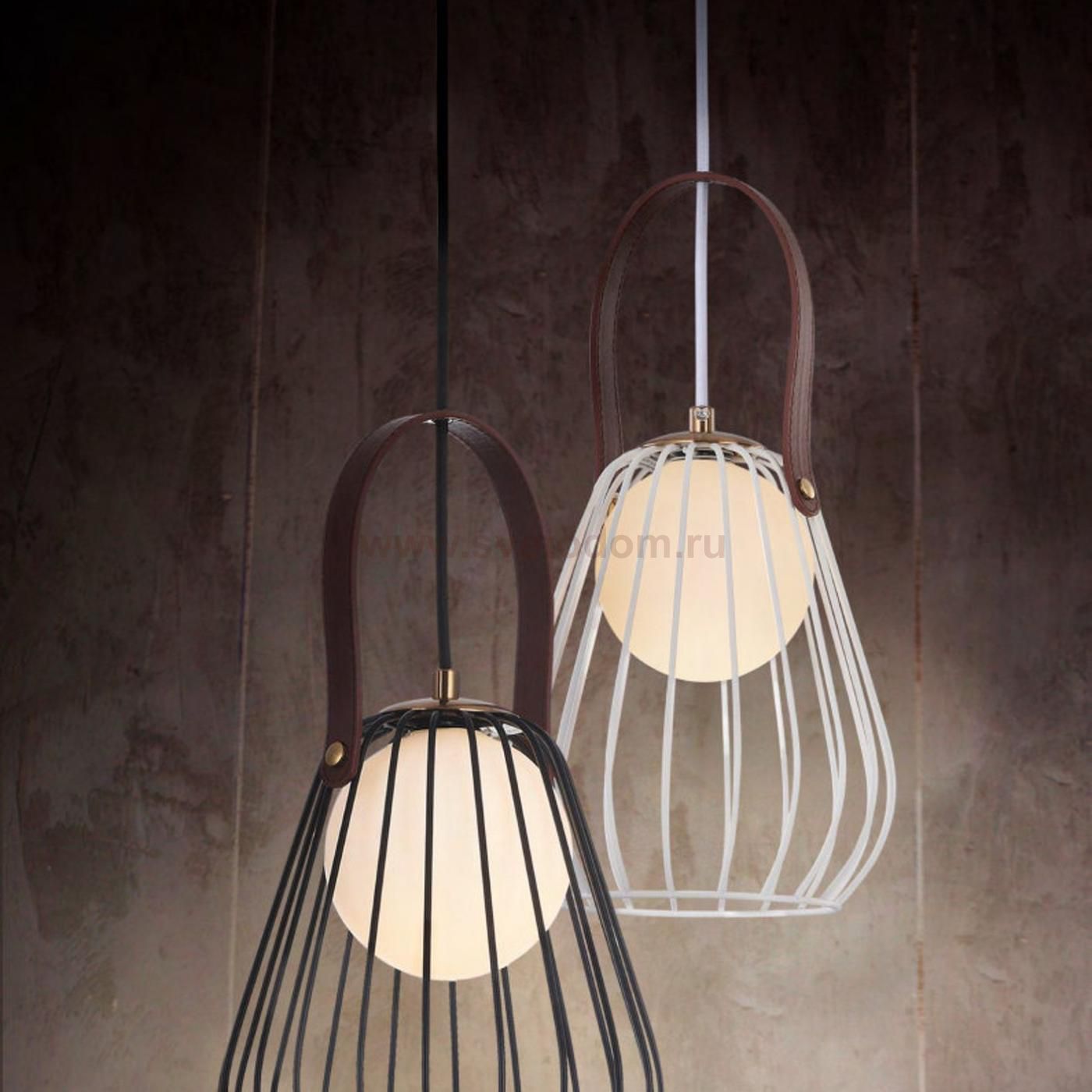 Каркас из металлических прутьев. Дополнен элементом в виде кожаного ремешка. Декоративный плафон из белого матового стекла. Комментарий