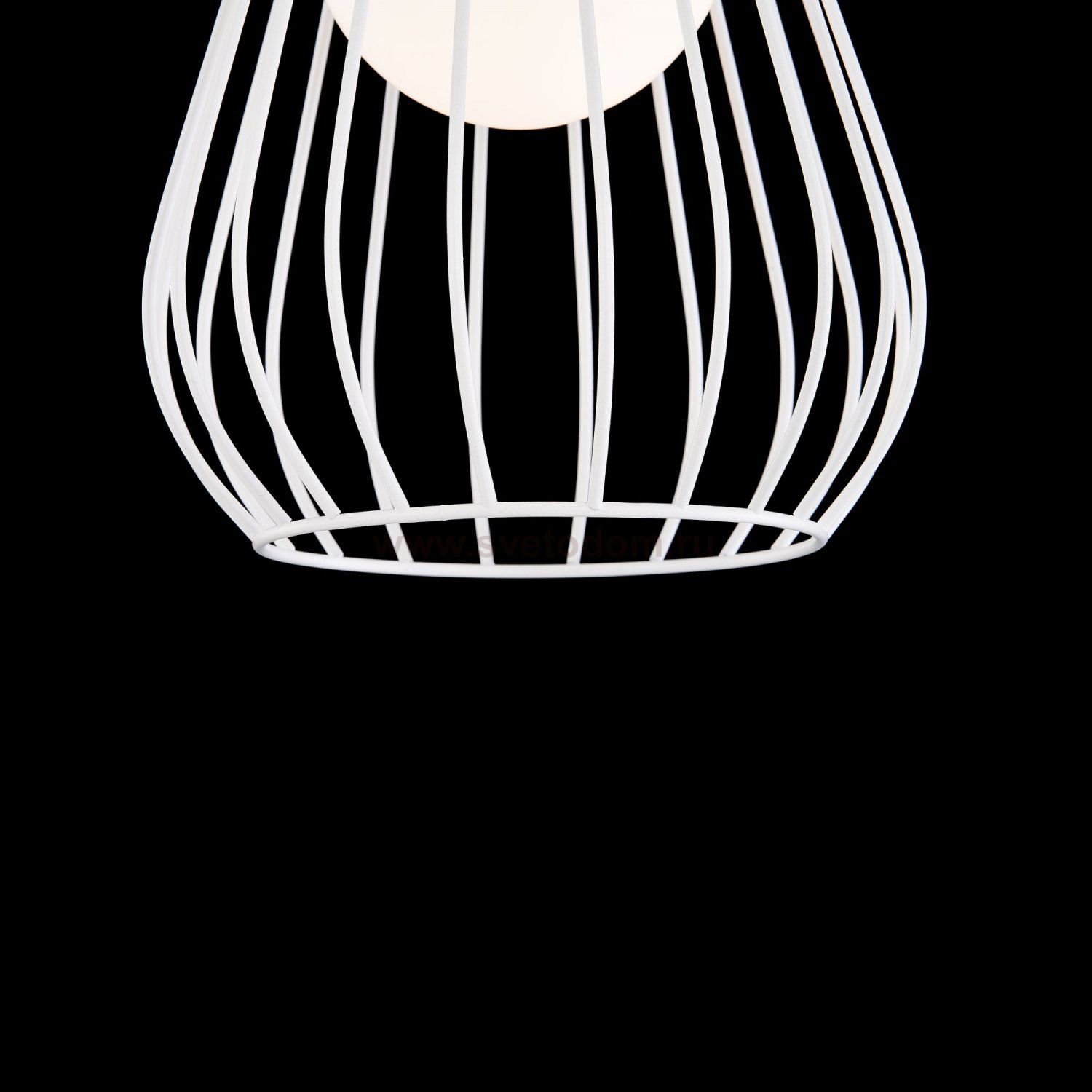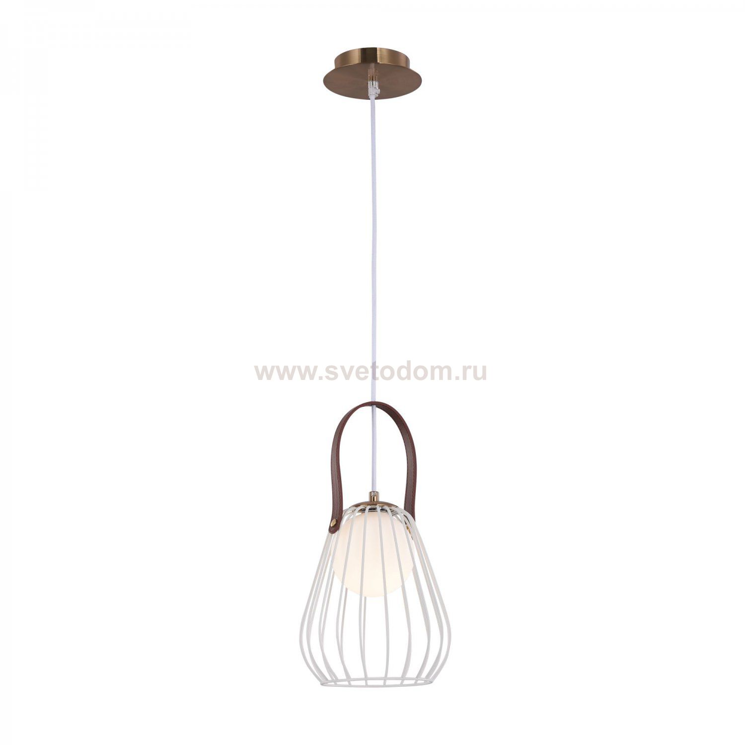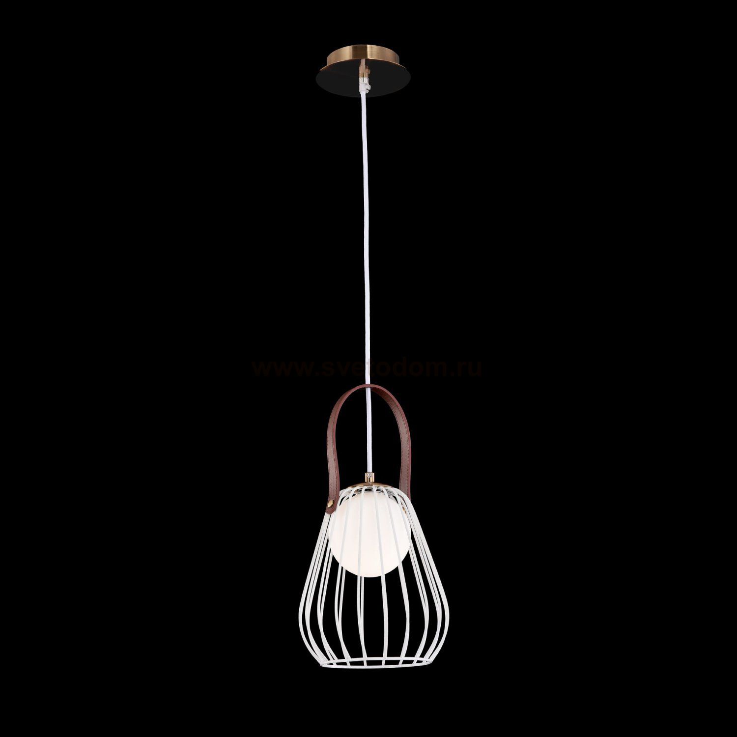Каркас из металлических прутьев. Дополнен элементом в виде кожаного ремешка. Декоративный плафон из белого матового стекла. Комментарий