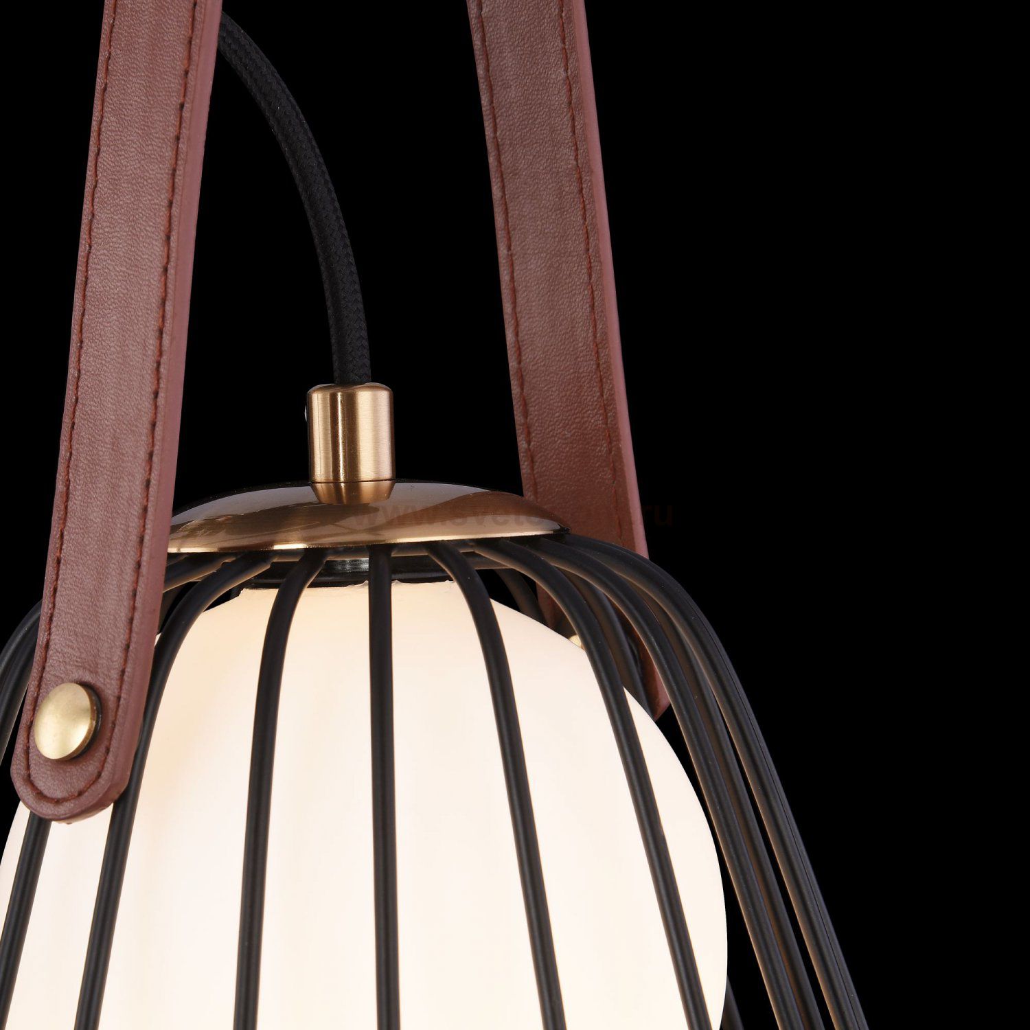 Каркас из металлических прутьев. Дополнен элементом в виде кожаного ремешка. Декоративный плафон из белого матового стекла. Комментарий
