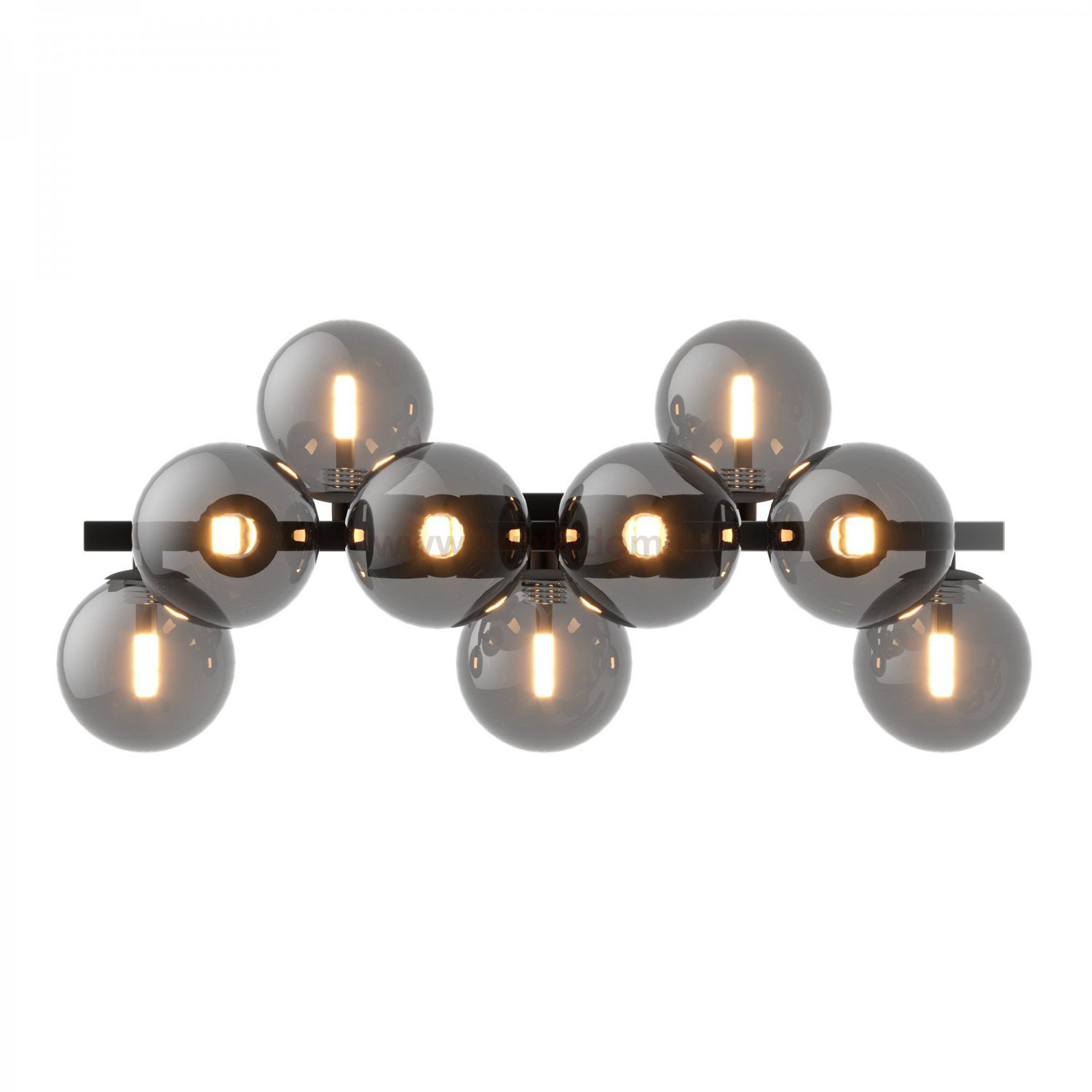 Металлическая арматура в четырех цветах: матовый черный, хром, золото, латунь. Плафоны — выдувное стекло. Цвета — дымчатый, янтарный, коньячный. Дизайн с имитацией молекулярной структуры. Высота подвесных светильников регулируется тросом. Лампа с цоколем G9.