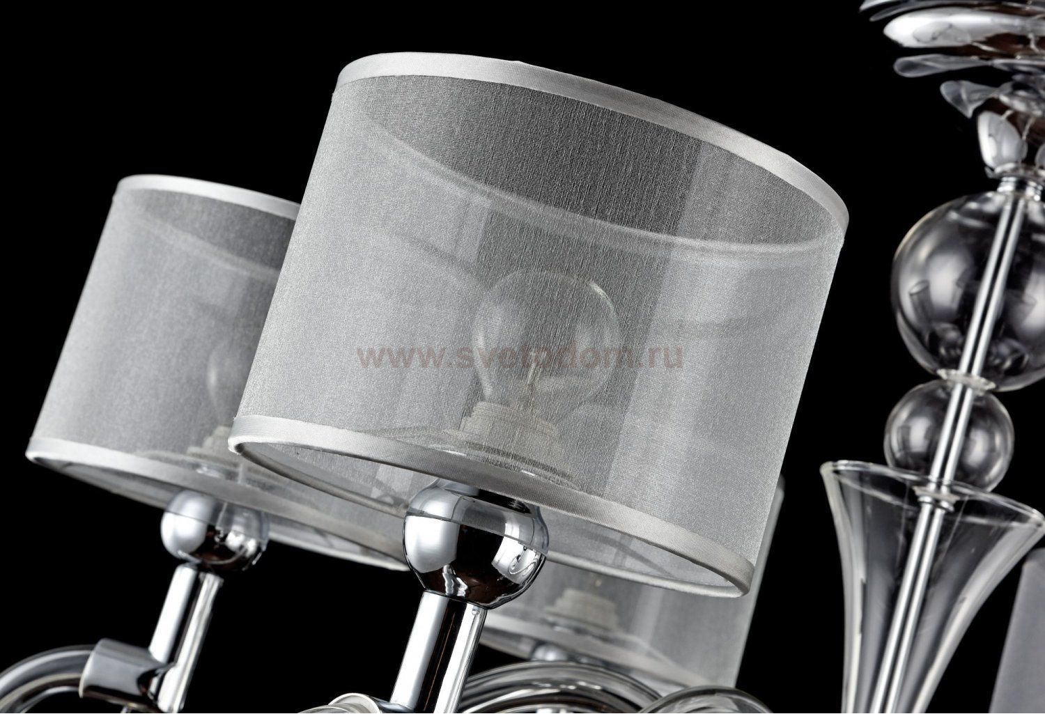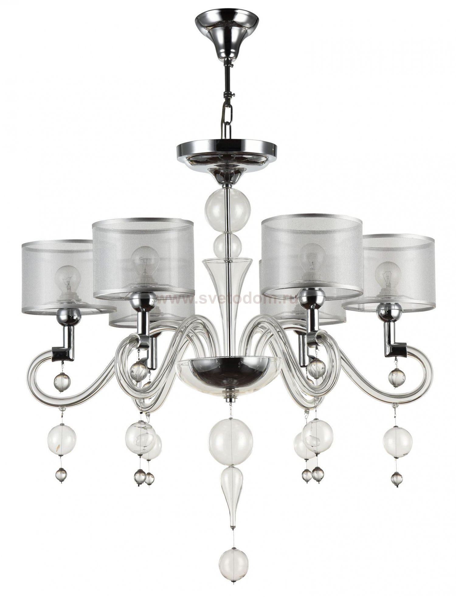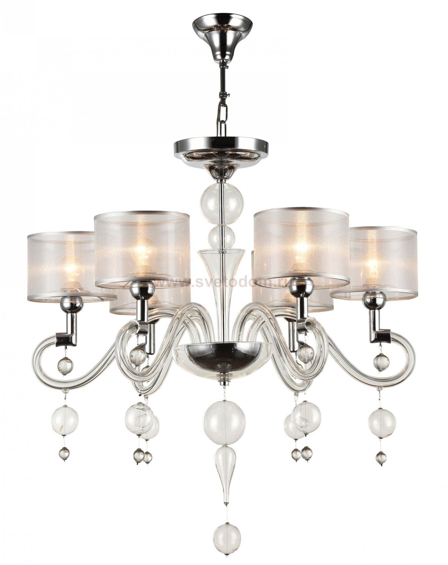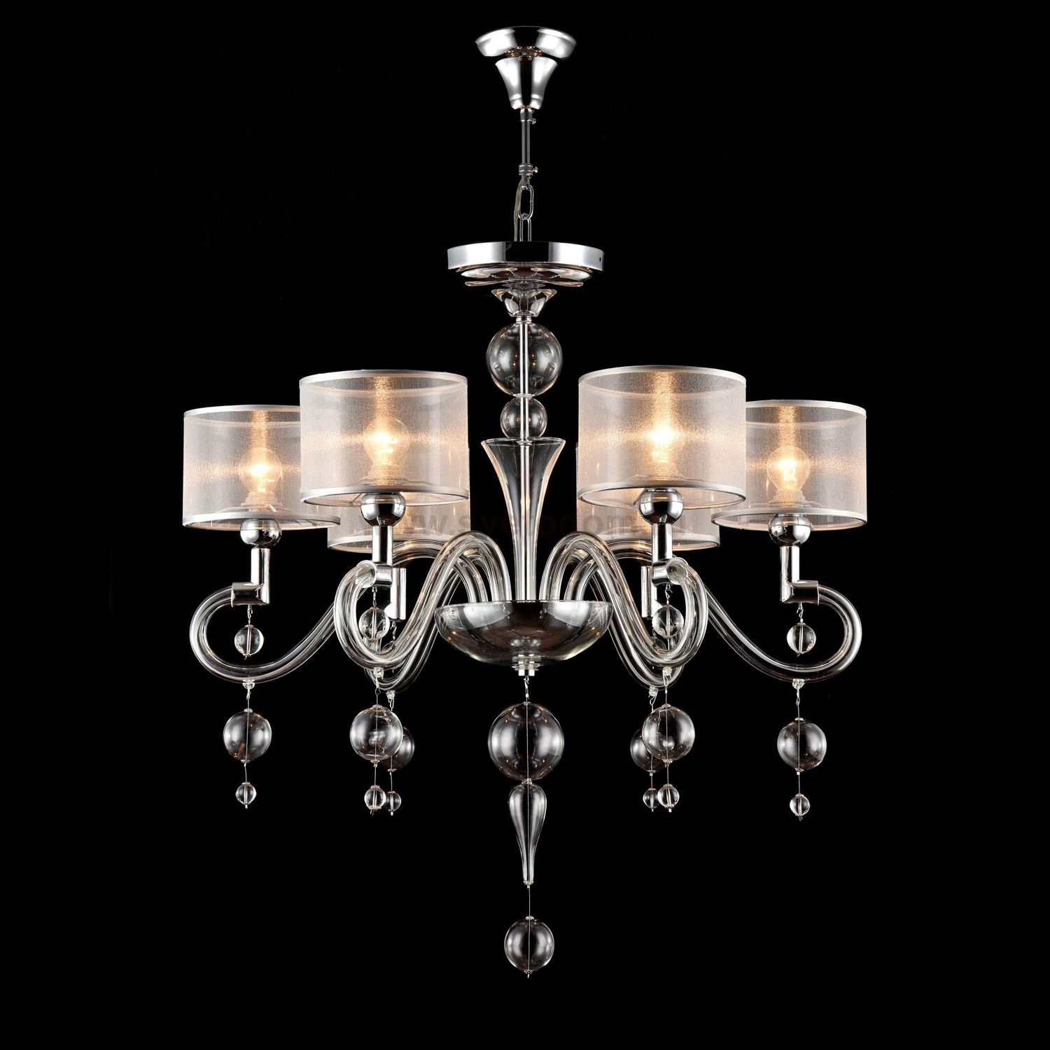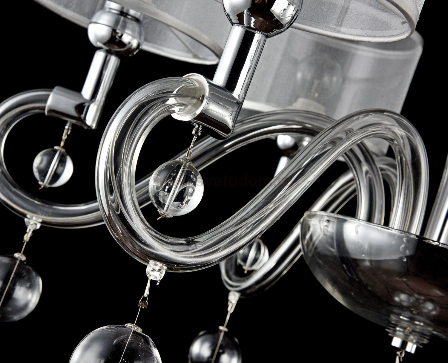 Хромированная металлическая арматура. Абажуры из белой органзы на ПВХ. Декор – прозрачное выдувное стекло. Крепление 2 в 1 – монтаж с цепью и без нее.