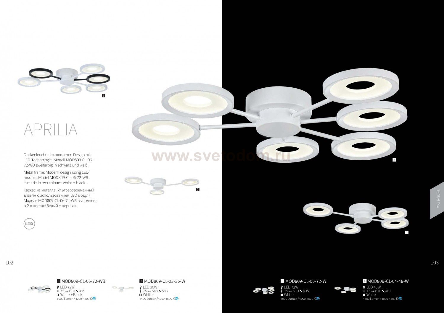 Каркас из металла. Ультрасовременный дизайн с использованием LED модуля. Модель MOD809-CL-06-72-WB выполнена в 2-х цветах: белый + черный. Комментарий