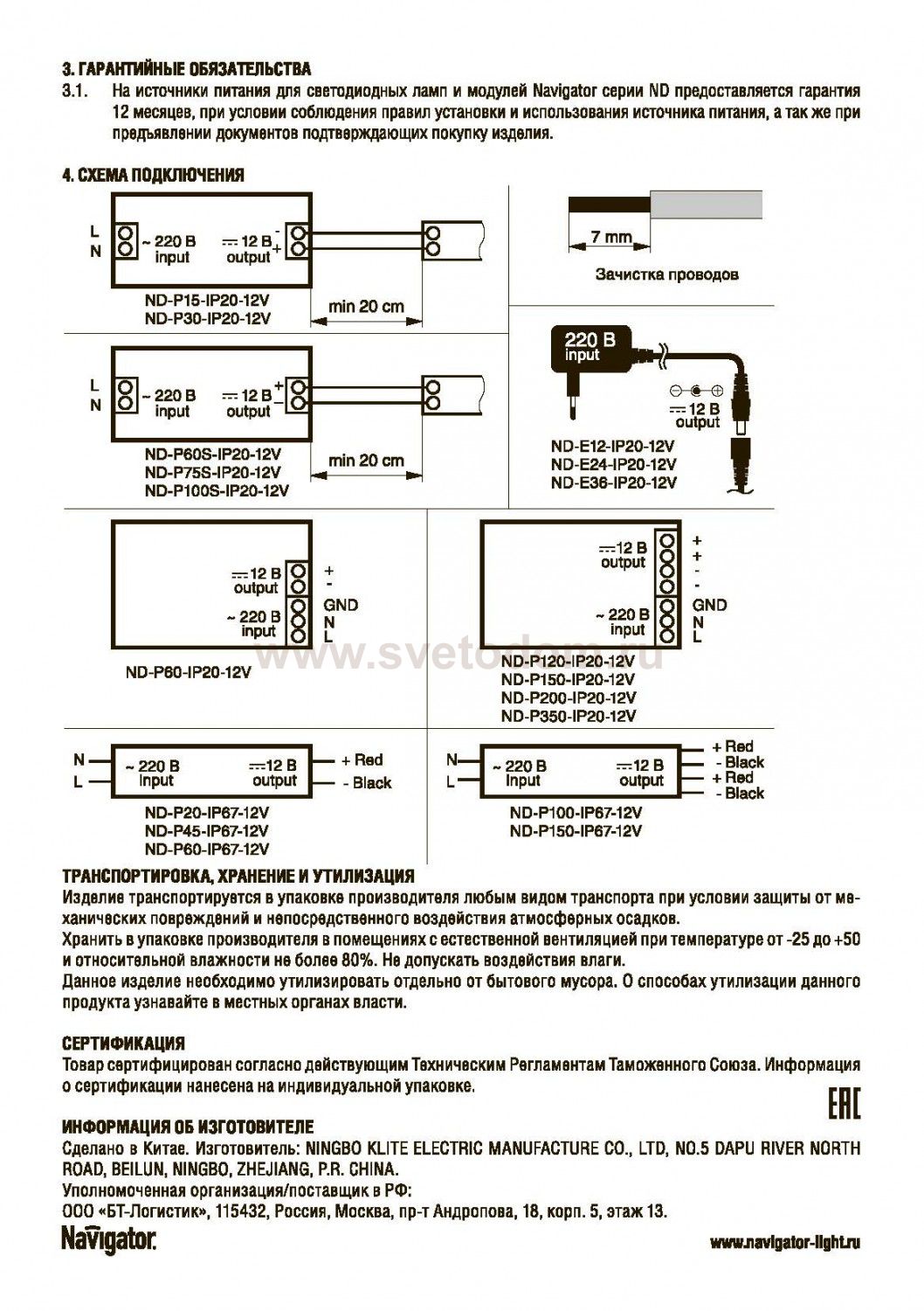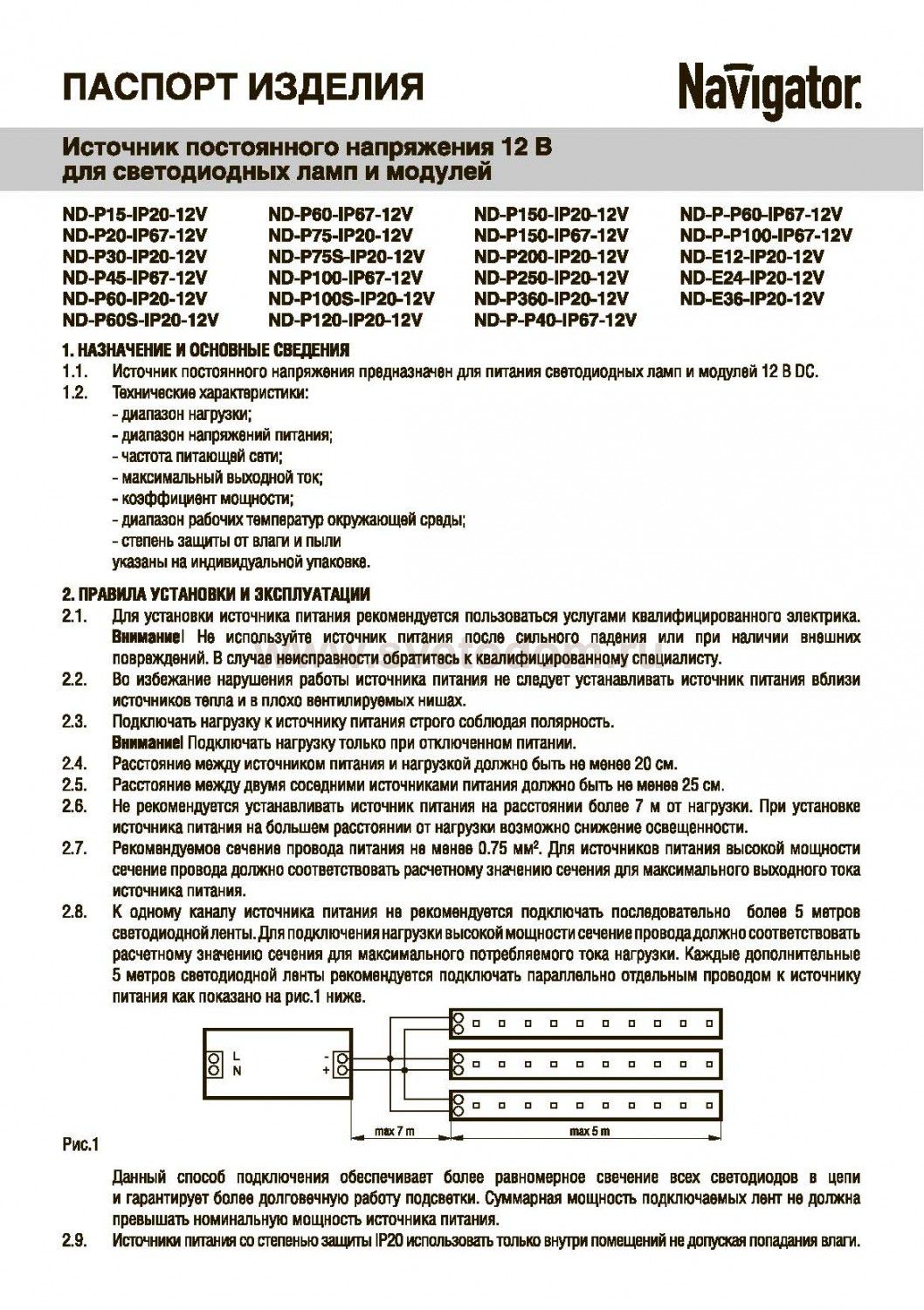 Драйверы Navigator ND-E – источники постоянного напряжения 12 В с вилкой и кабелем с выключателем и разъемом джек 5.5 мм. Адаптеры сконструированы с учетом удобства использования и позволяют быстро подключать светодиодную ленту без пайки. Адаптеры работают в широком диапазоне входного напряжения 100 – 240 В и при этом обеспечивают коэффициент мощности до 0.85. Адаптеры Navigator ND-E обеспечивают длительную и стабильную работу источников света на основе светодиодов и оснащены защитой от короткого замыкания и от перегрузки. Срок службы адаптеров составляет более 30 000 часов. Драйверы серии ND-E производятся в интерьерном исполнениии IP20.