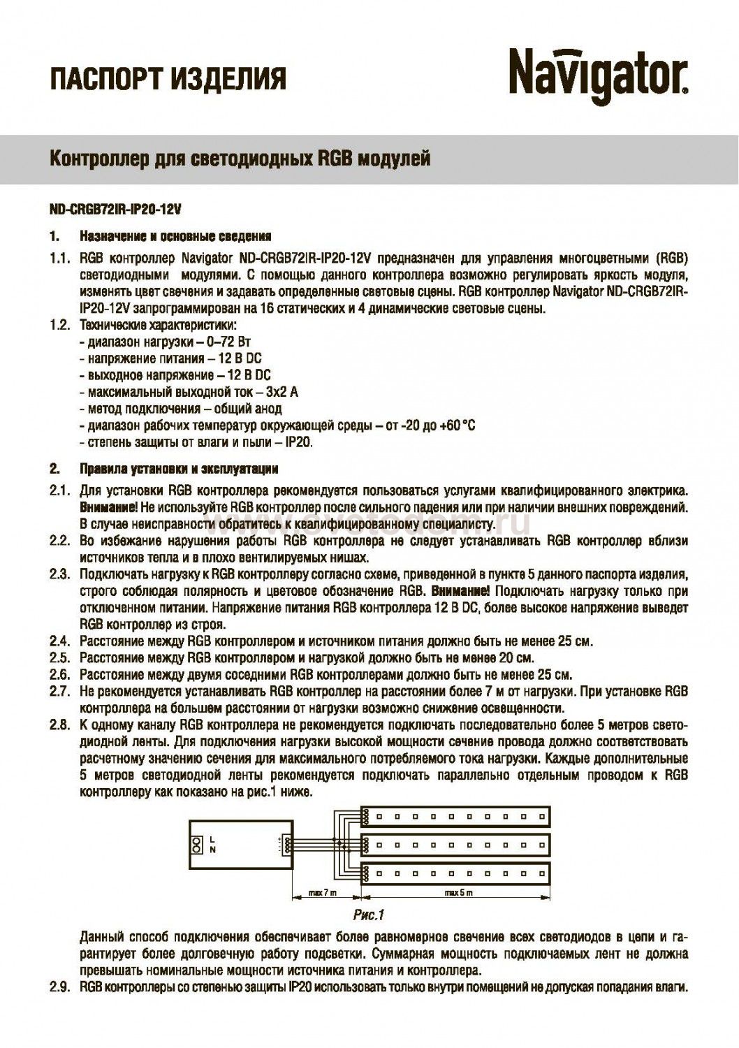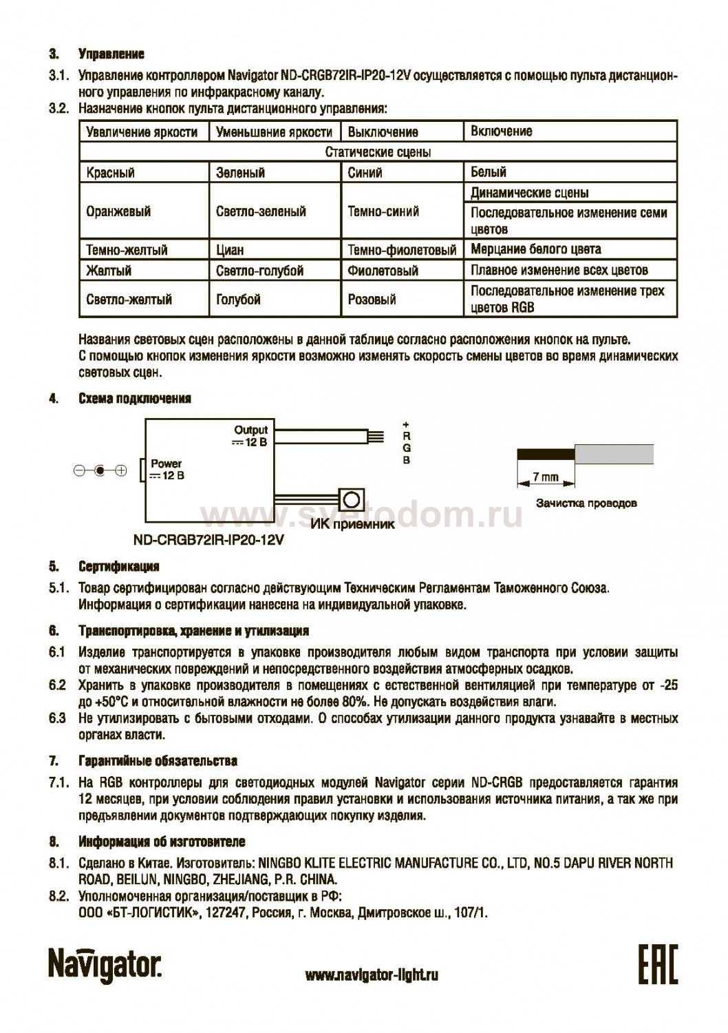 Драйверы Navigator ND-CRGB — контроллеры для создания статических и динамических сцен при применении многоцветных светодиодных модулей (СД ленты RGB). Контроллеры ND-CRGB позволяют получить до 16 статических и 14 динамических световых сцен. Так же с помощью данных контроллеров возможно управлять интенсивностью света RGB модулей. Метод подключения контроллеров к светодиодной ленте — общий анод, управление осуществляется по общему положительному каналу и трем каналам с «-« полярностью R,G,B. Драйверы ND-CRGB оснащены проводами для подключения кабеля питания и нагрузки.