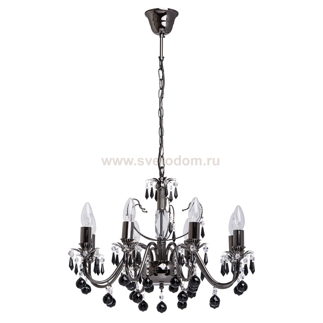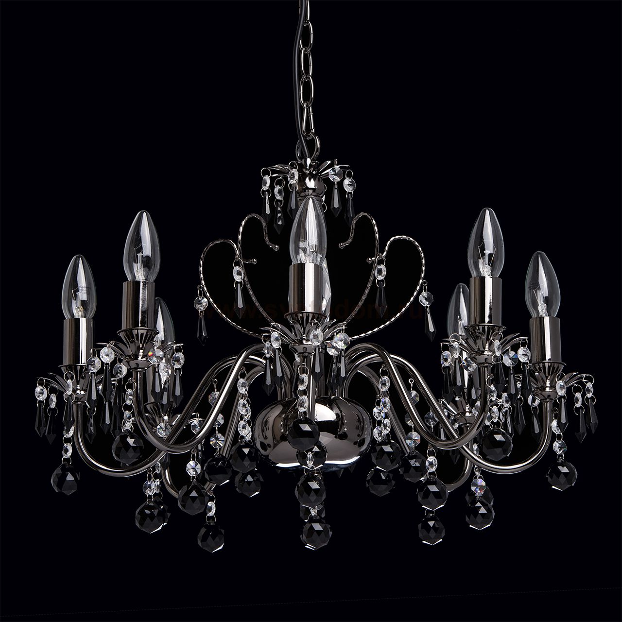Уникальное цветовое решение – гламурный черный цвет. Популярная модель в новом исполнении. Высокие параметры освещенности. В декоре используется высококачественный хрусталь прозрачный и глубокого черного цвета. Широкая семья – в коллекции представлены люстры на 5 и 8 лампочек, бра. Технология производства