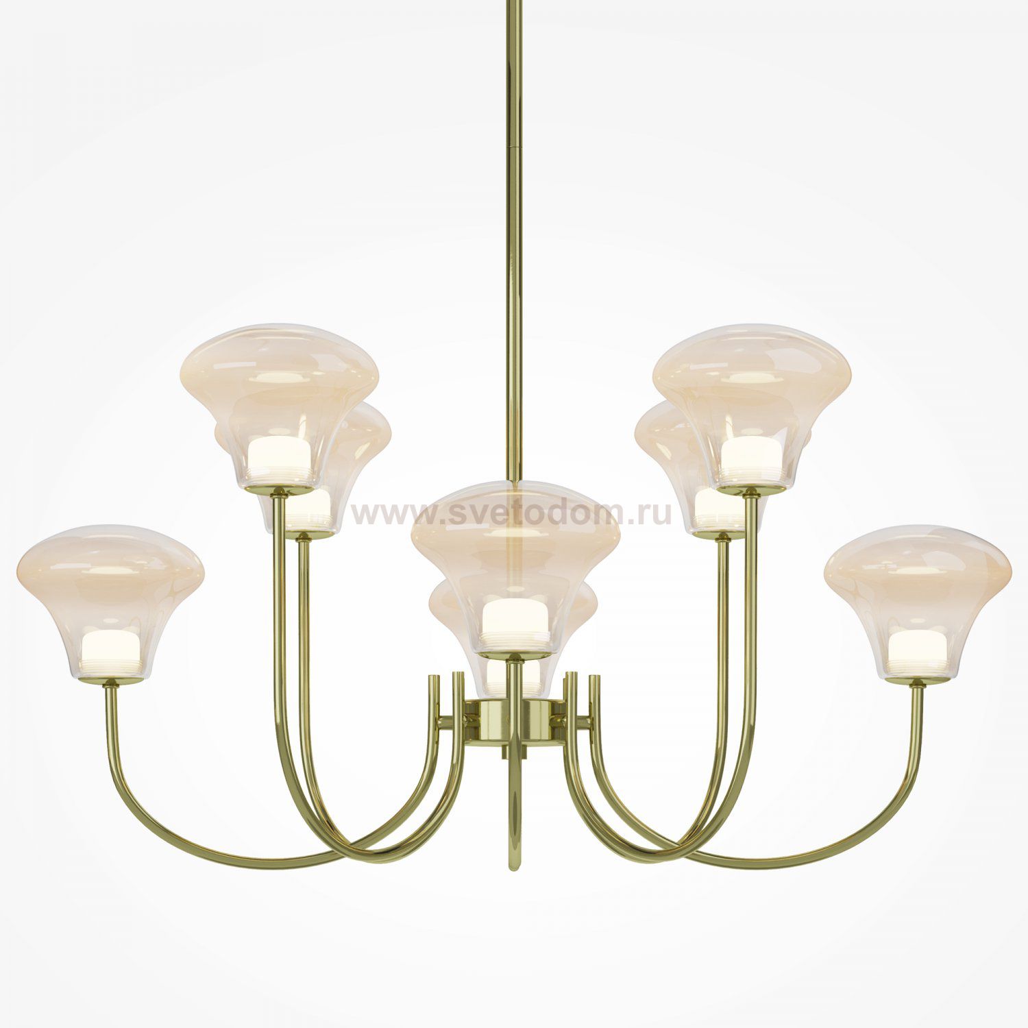 Серия Dynasty вдохновлена атмосферой бальных залов и представлена подвесными светильниками (люстры) на 6 и 8 плафонов, настенным светильником (бра). Обтекаемая форма плафона с градиентом от янтарного к прозрачному. Арочный дизайн металлической арматуры в цвете сатинированной латуни. Блеск металла и глянец стекла дополнены светом LED-источника (3000K). Высота люстр регулируется разборной штангой. Светильники Dynasty станут ярким акцентом в гостиной, столовой, спальне, рабочем кабинете или прихожей.