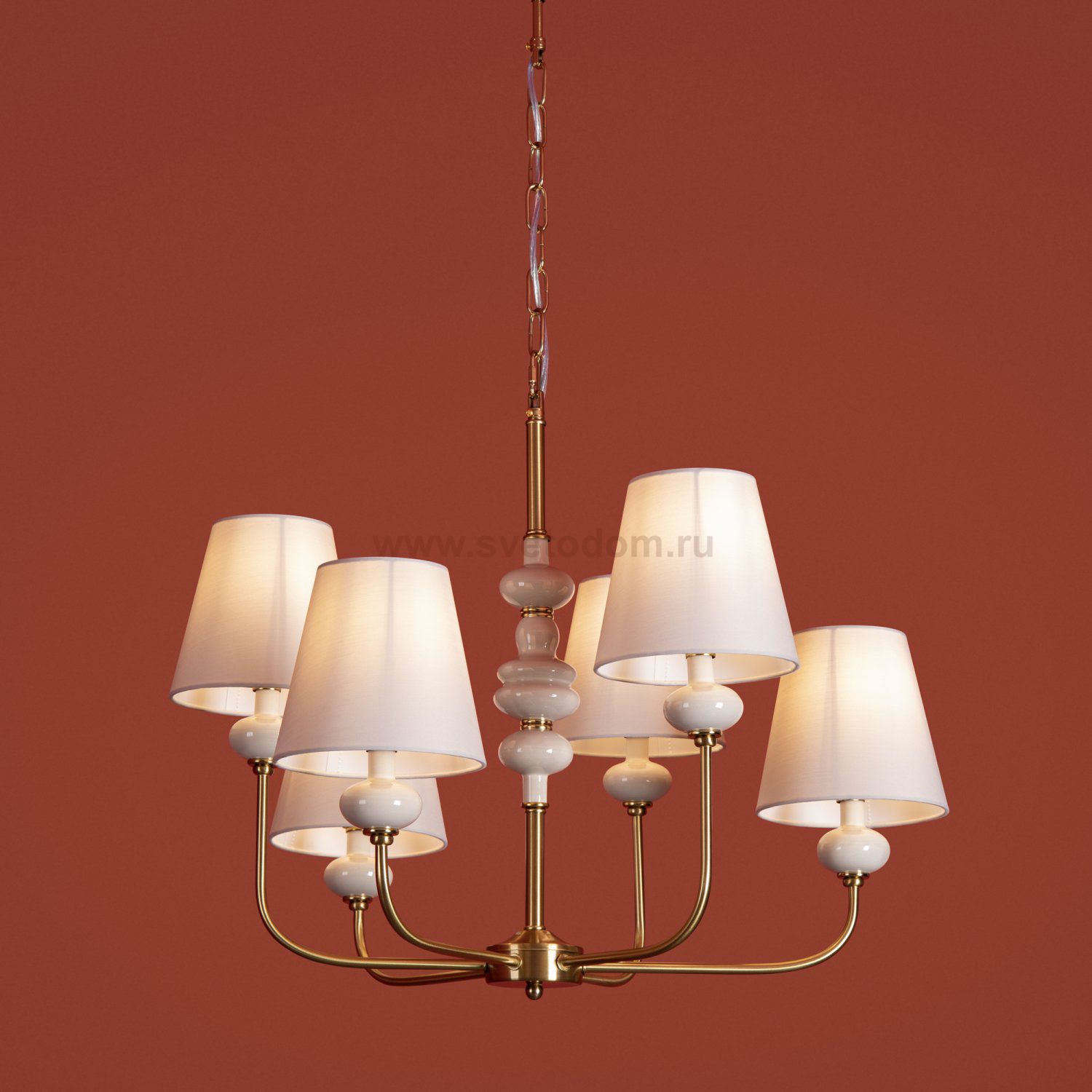 Материал арматуры — металл, цвет — латунь. Подвесные светильники с цоколем E14. Светильники с керамическими декоративными элементами серо бежевых оттенков. Белый абажур, выполнен из натуральной ткани. Сочетание классической элегантности с современным дизайном создает утонченную атмосферу в интерьере.