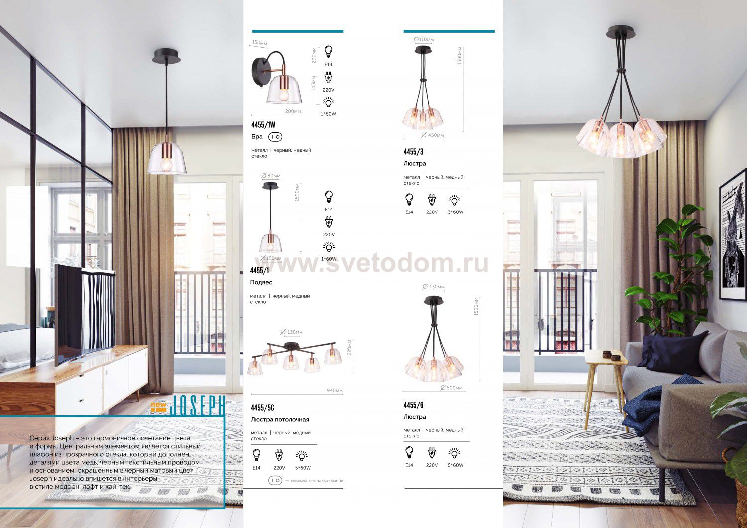 Линия Joseph - это гармоничное сочетание цвета и формы. Центральным элементом является стильный плафон из прозрачного стекла, который дополнен деталями цвета медь, черным текстильным проводом и основанием, окрашенным в черный матовый цвет. Joseph идеально впишется в интерьеры в стиле модерн, лофт и хай-тек.