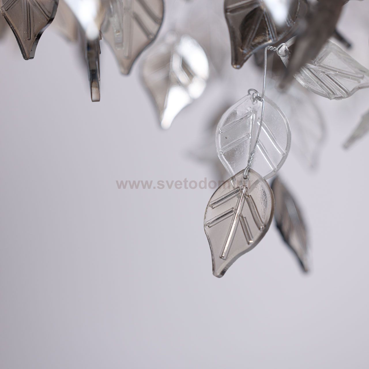 Основание подвесной люстры выполнено по технологии художественного литья из сплава алюминия с цинком и гальванизировано в цвет хрома. Потолочная чаша закрыта фактурным художественным литьем. Люстра декорирована подвесками из прозрачного и гальванизированного в дымчатый цвет стекла в форме листьев. Комментарий
