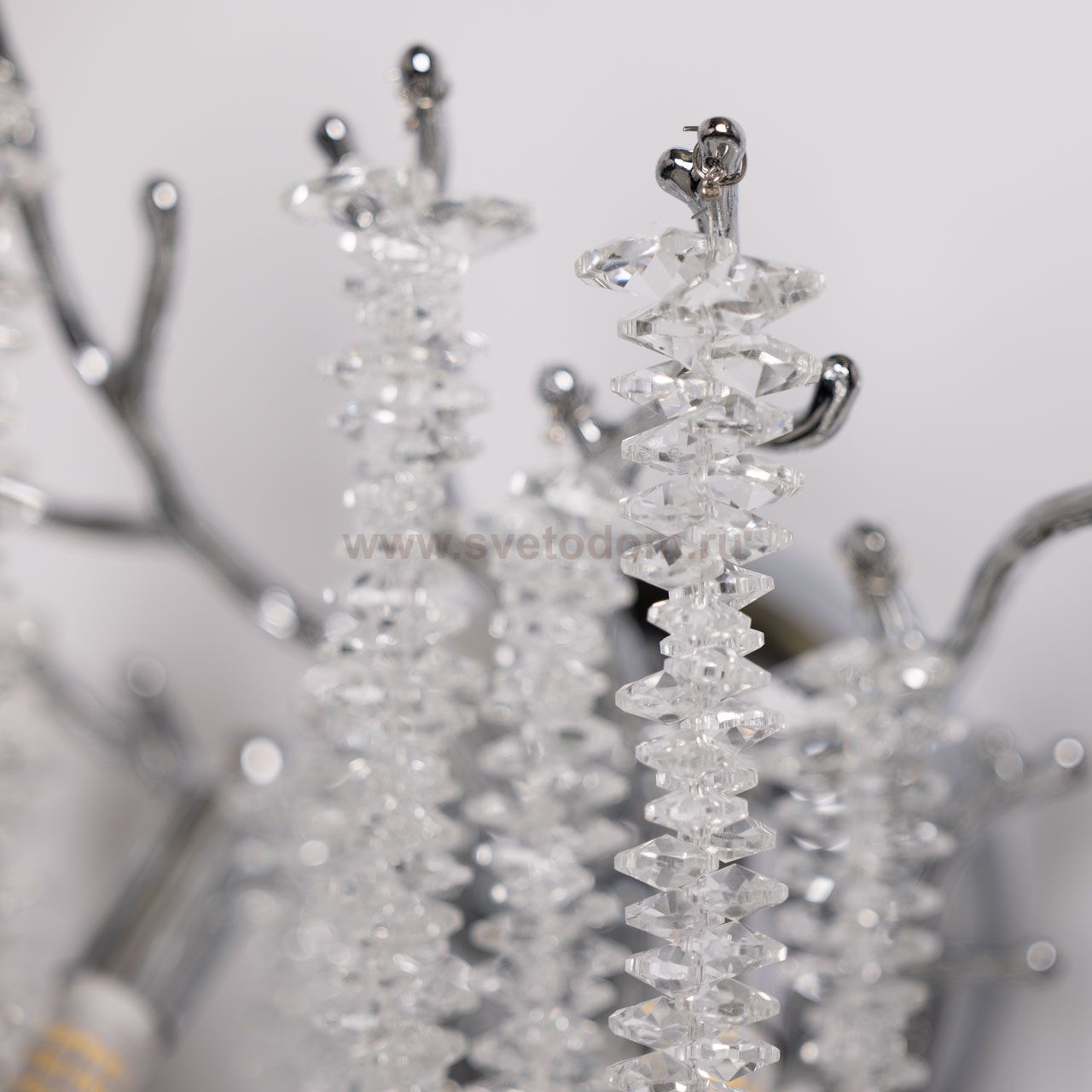 Основание настенного бра выполнено по технологии художественного литья из сплава алюминия с цинком и гальванизировано в цвет хрома. Настенное бра декорировано гроздьями из прозрачного хрусталя. Комментарий