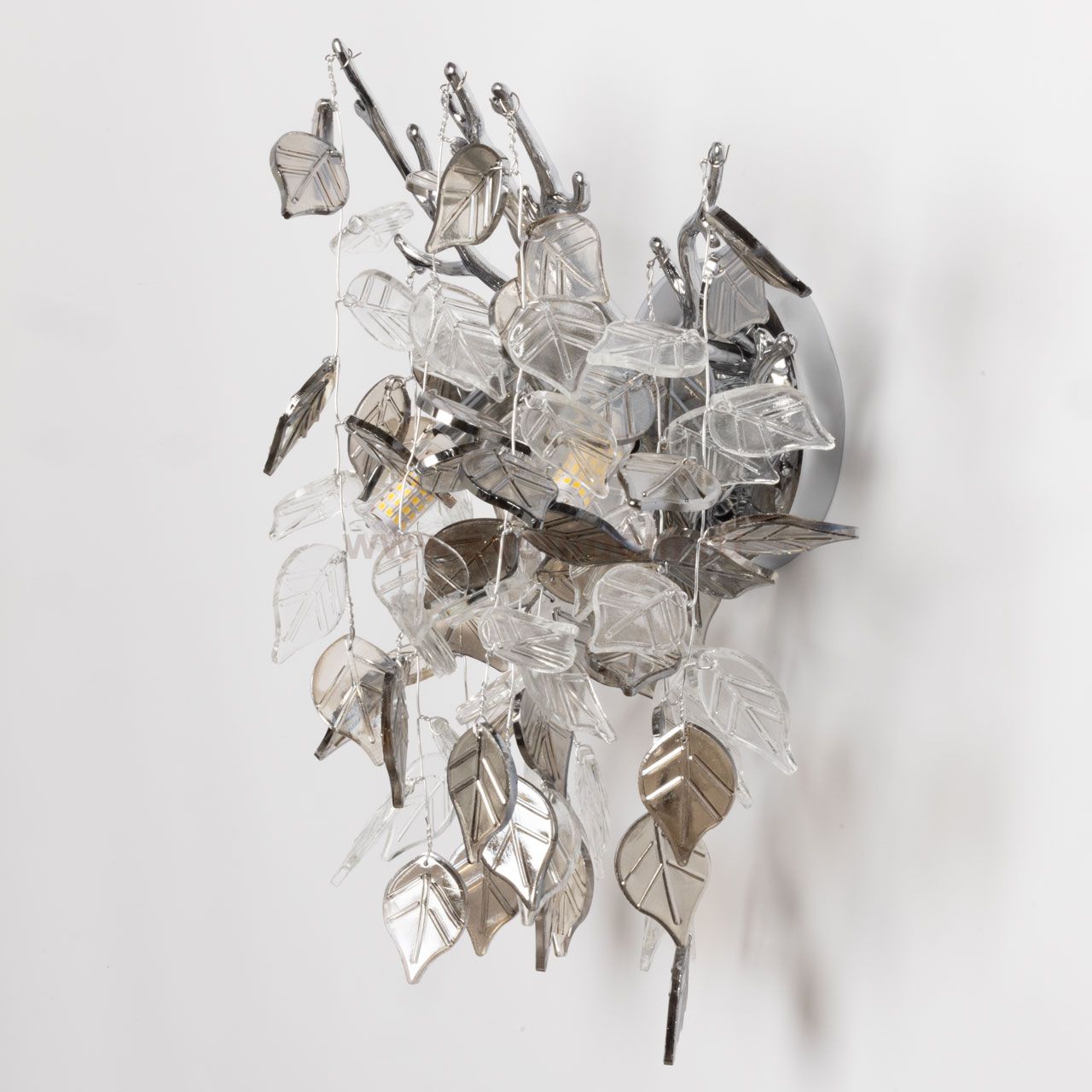 Основание настенного бра выполнено по технологии художественного литья из сплава алюминия с цинком и гальванизировано в цвет хрома. Настенное бра декорировано подвесками из прозрачного и гальванизированного в дымчатый цвет стекла в форме листьев. Комментарий