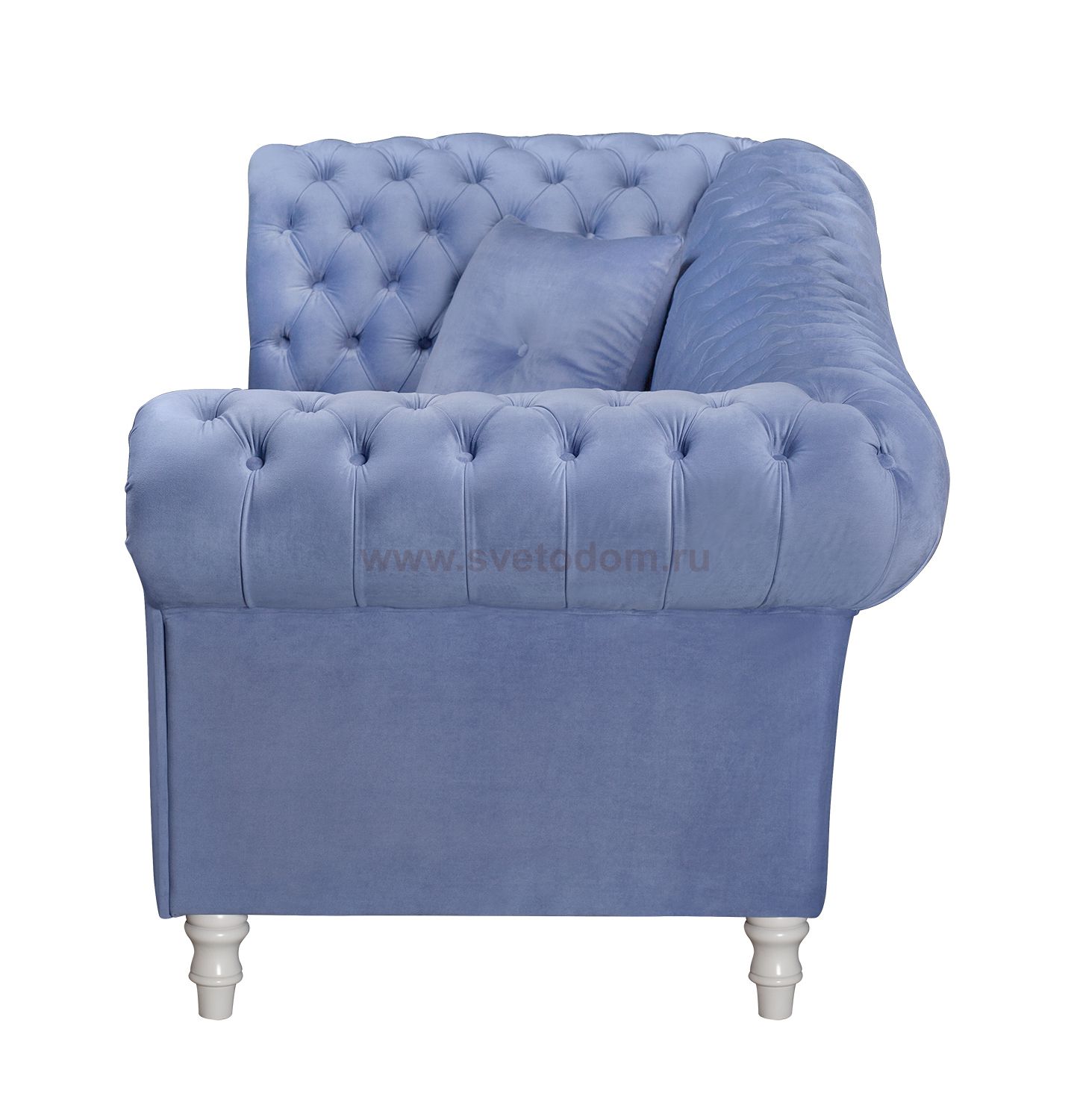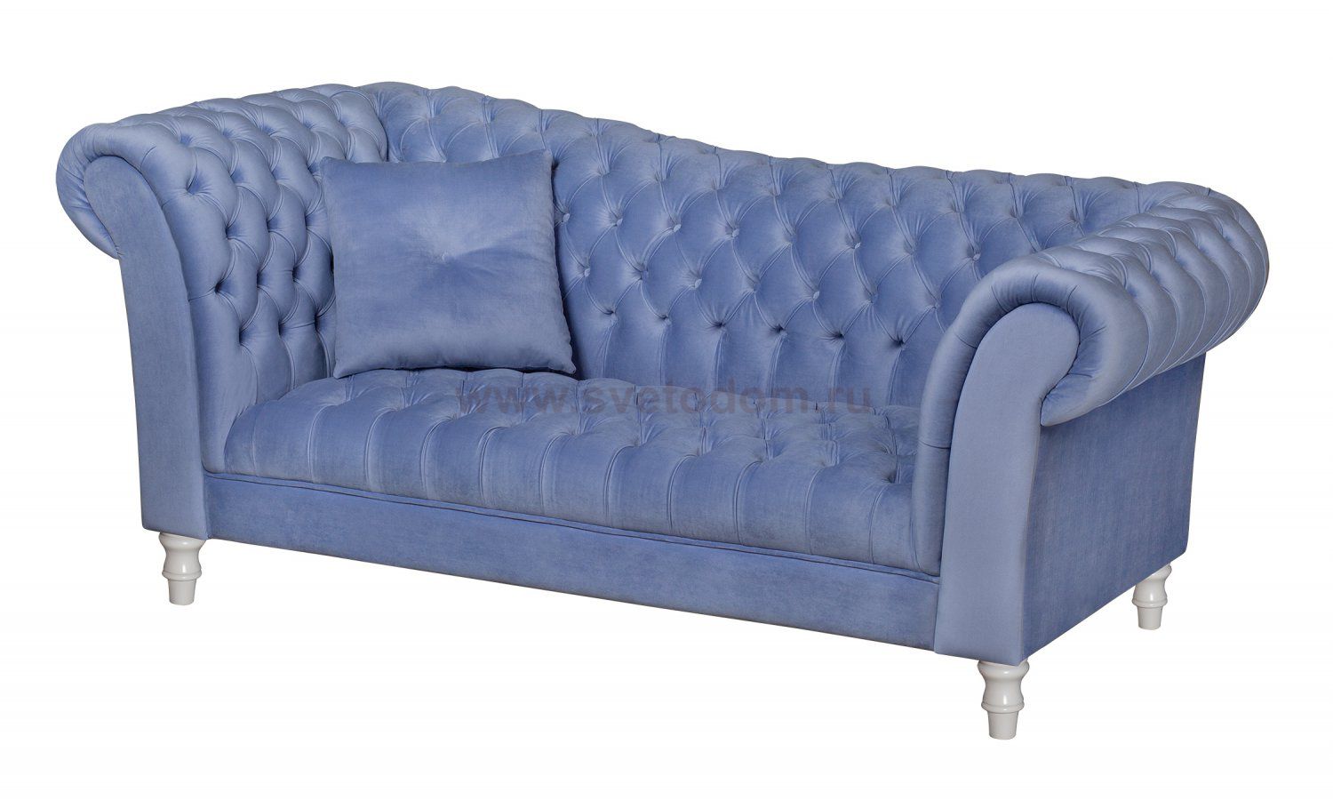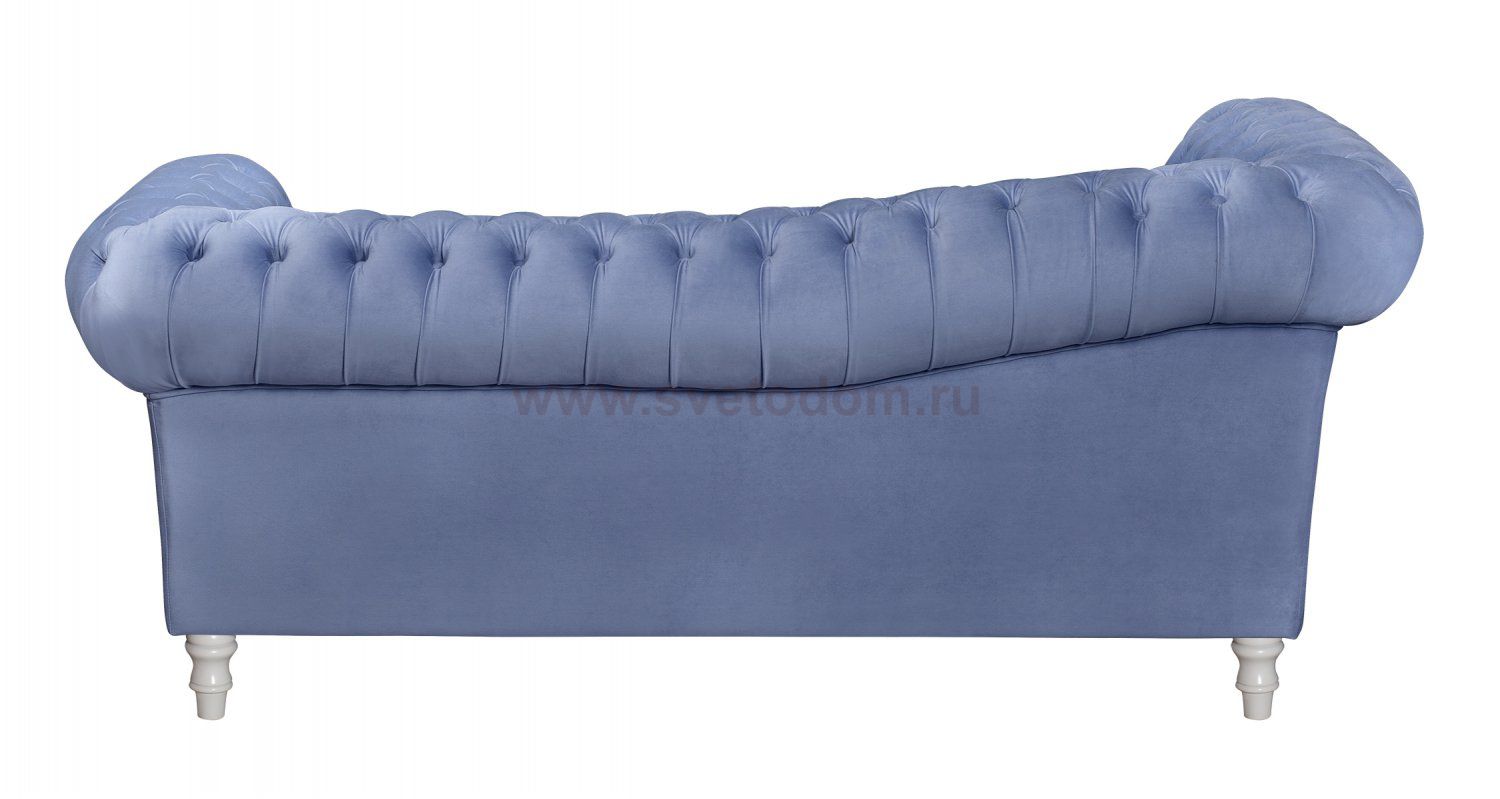 Голубой велюровый диван с белыми ножками Lina Blue-B для гостиной, библиотеки или кабинета. Lina Blue-W с каркасом из массива дерева и мягкими подлокотниками.