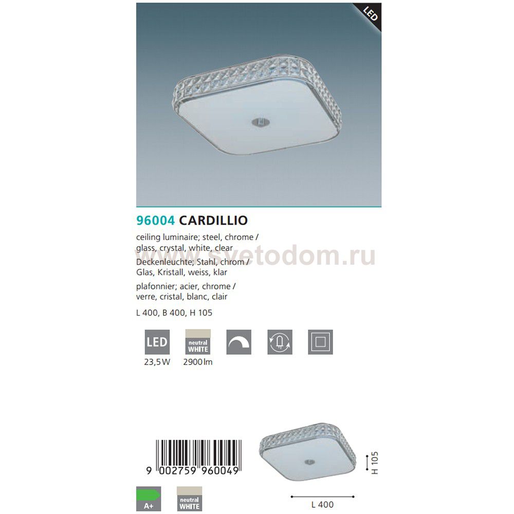 Светильник потолочный Eglo 96004 CARDILLIO сделает Ваш интерьер современным, стильным и запоминающимся! Наиболее функционально и эстетически привлекательно модель будет смотреться в гостиной, зале, холле или другой комнате. А в комплекте с настенными бра и торшером из этой же коллекции, сделает интерьер по-дизайнерски профессиональным и законченным.