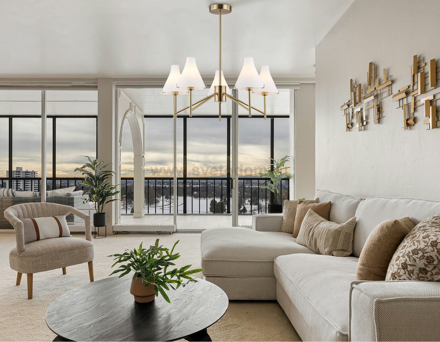 Подвесная люстра из коллекции HIGH LIGHT. Модель LH57133 представлена в стиле неоклассика. Люстра выполнена из металлического каркаса цвета латунь и стеклянных матовых плафонов. Для данной модели подойдут лампы с цоколем Е14. Люстра будет прекрасным дополнением в любом помещении.