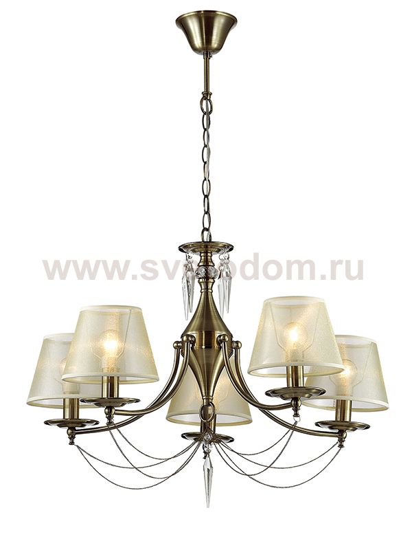 Храктерная особенность артикула 3230/5: Люстра 3230/5 серии Donsi оформлена в классическом стиле. Люстра состоит из абажура из органзы и бронзовой арматуры, украшенной декоративными цепочками и подвесками из хрусталя. Классика и изящность формы данной модели создадут неповторимую атмосферу в доме. Цоколь E14. Мощность 5x40W. Нет ламп в комплекте.