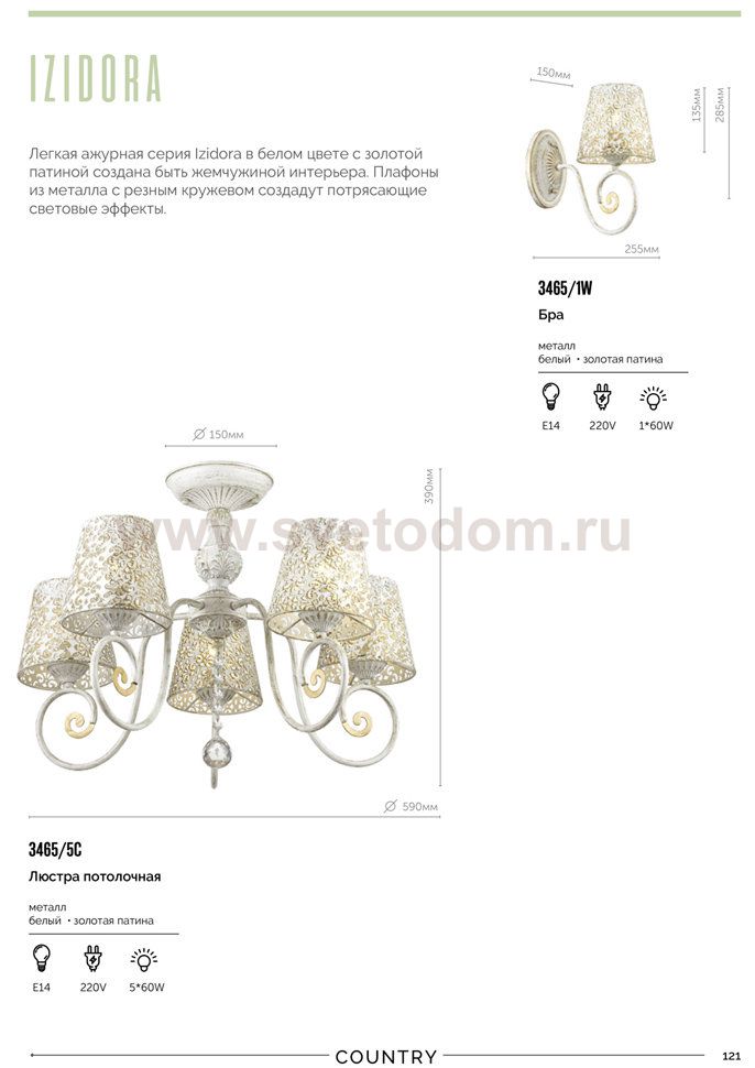Линия Izidora выделяется на фоне других изделий оригинальным решением для плафона: он выполнен из металла того же цвета, что и основание, белый цвет с золотым патинированием.