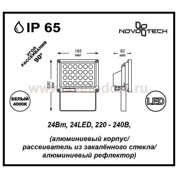 Уличный светодиодный прожектор модели Novotech 357190 из серии ARMIN отличается следующим качеством: Корпус светильника состоит из алюминия. Это металл, основными достоинствами которого являются — устойчивость к практически всем видам негативного воздействия окружающей среды, коррозии, небольшой вес, по сравнению с другими видами металла и экологическая безопасность материала. Рассеиватель сделан из закаленного стекла. Оно выдерживает температуру от -70 до 250С., а так же в 5-6 раз прочнее обычного. Рефлектор - алюминий. Экономичность (КПД порядка 90%), отсутствие токсичных элементов (не наносят вред здоровью, не требуют специальной утилизации), отсутствие ультрафиолетового излучения, пожаробезопасность (не нагреваются), морозостойкость, ударопрочность и устойчивость к вибрациям. Диапазон рабочих температур от -20 до +50 градусов Цельсия.