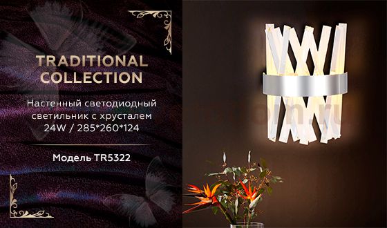 Настенный светодиодный светильник из коллекции TRADITIONAL. Модель TR5322 представлена в современном стиле Арт-деко. Светильник выполнен в цвете хром, с превосходным прозрачным хрусталем, каркас изготовлен из металла.Эта модель оснащена встроенными светодиодами, благодаря чему вы забудете о замене ламп. Светильник будет прекрасным дополнением в гостиной, спальне или детской.