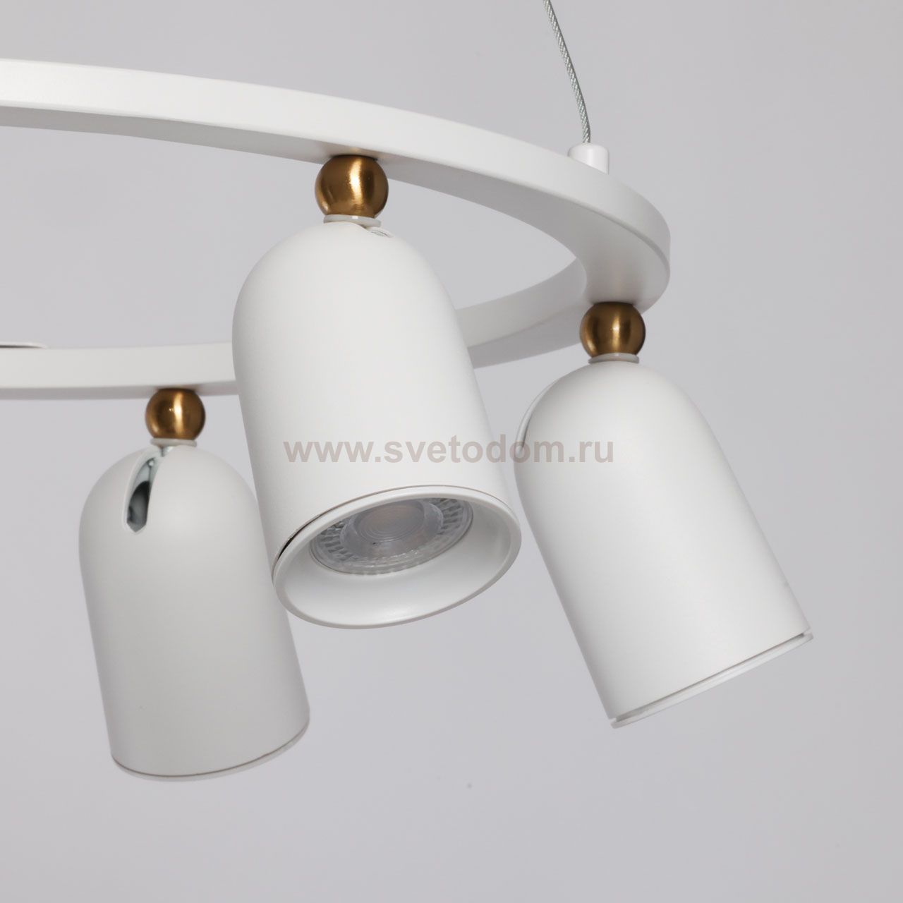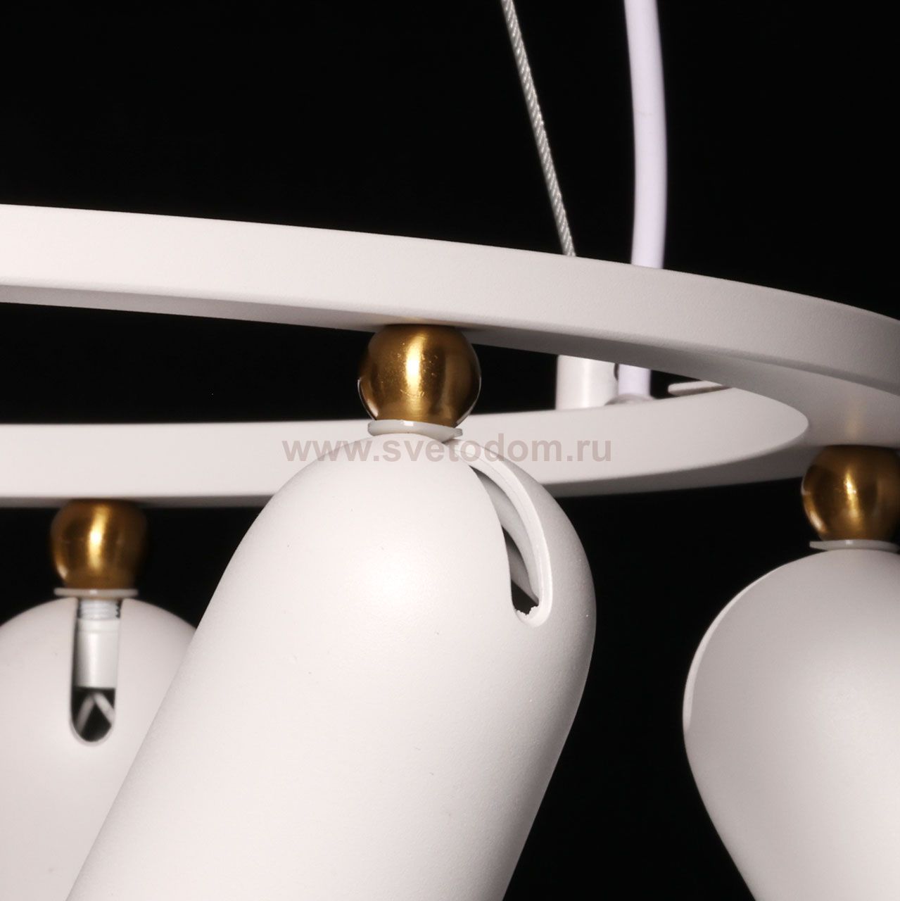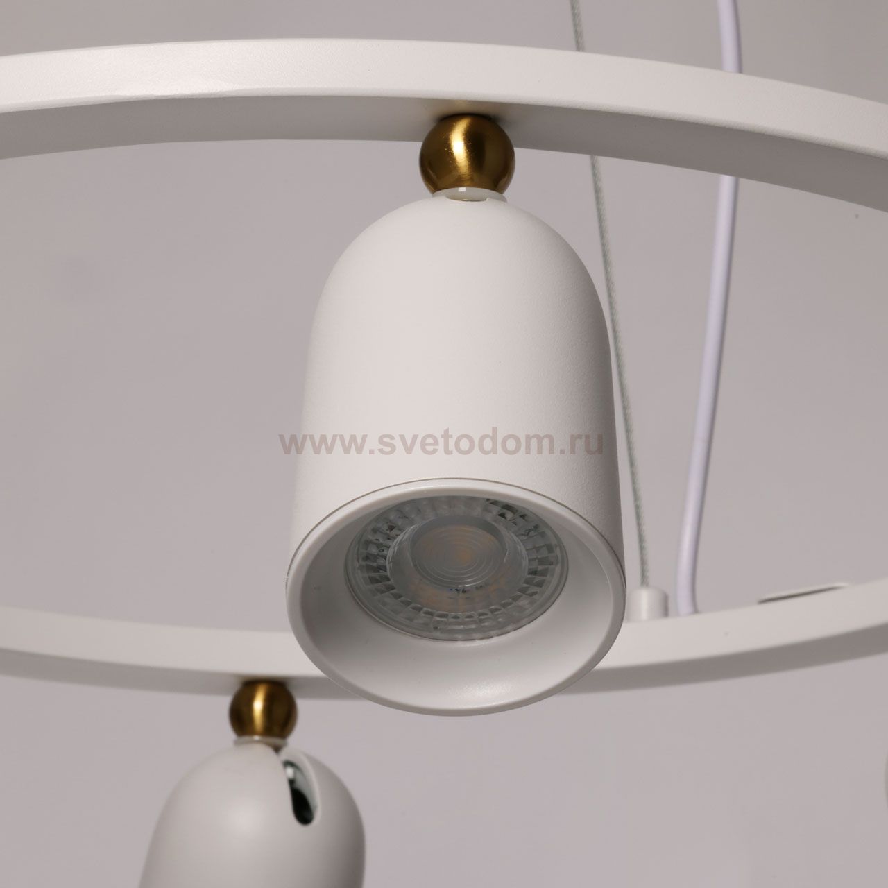 Белый цвет придает люстре свежий и современный вид. Для дополнительного декоративного эффекта, плафоны декорированы металлической сферой. Сочетание белого цвета и декора цвета латуни добавляет люстре изысканности. Поворотные плафоны позволяют направлять световой поток в нужную сторону, что создает комфортное освещение. Вариативность световых решений и фактур подчеркнет стиль и индивидуальность интерьера. Возможность регулировать комфортную высоту. Заменяемые источники света удобны в эксплуатации. Технология производства